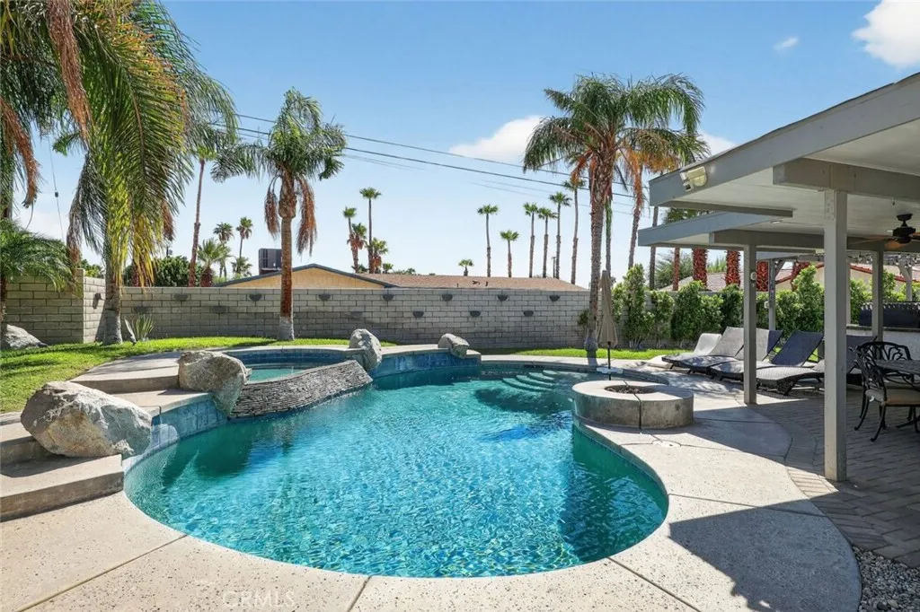 Welcome to your dream retreat in the heart of Palm Springs! This beautifully styled 4-bedroom, 2.5-bath estate blends resort-style luxury with everyday comfort and it is fully equipped for both relaxation and entertaining. Inside, enjoy an open, airy layout with high ceilings, recessed lighting, and abundant natural light. The chef's kitchen includes all essential appliances, a kitchen island with breakfast bar, and a formal dining room, perfect for casual meals or hosting dinner parties. The spacious living room features a cozy fireplace, adding warmth and ambiance. The primary suite is a true retreat with its own fireplace, while three additional bedrooms offer flexibility for guests, family, or a home office. You will also find a dedicated indoor laundry room, a generous garage, and ample driveway space with room to park a boat or RV. Enter into an entertainer's backyard that has it all: a built-in BBQ, covered seating areas, a covered outdoor pool table, and even your own golf course setup. Take a dip in the heated pool or soak in the infinity edge Jacuzzi, then unwind around the fire pit under the desert sky. Fully paid-off solar panels provide low energy costs and sustainable power, perfectly suited for desert living. Whether you are entertaining guests or enjoying peaceful evenings at home, this Palm Springs oasis has everything you need. Welcome home!