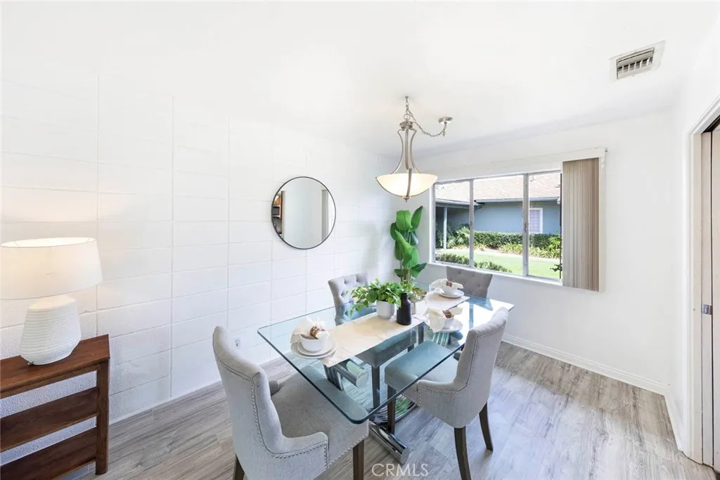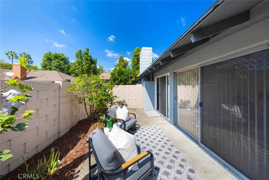 Enjoy North Tustin style living for less! This charming single-level condo offers 2 bedrooms, 2 bathrooms, and approximately 1,283 sq. ft. of beautifully updated living spaceall with no steps at the entry or inside the home. Located in the highly sought-after Hewes Middle School and Foothill High School district, this home has no one above or below for added privacy. Designed with a mid-century modern vibe, the home is filled with natural light from walls of windows and sliding doors that create a bright, airy feel throughout. Inside, youll find thoughtful upgrades throughout. The kitchen was fully remodeled in 2012 with granite countertops, custom cabinetry, and modern appliances. An LG refrigerator (2024) is included with the home, along with a stackable washer and dryer conveniently located in the kitchen. Additional kitchen upgrades include a new exhaust fan (2020) and disposal (2024). The guest bath vanity and granite countertop were updated in 2018, while the primary bathroom was remodeled in 2019 by a licensed contractor, featuring a whirlpool tub, new plumbing, tile work, window, and exhaust fan. Electrical updates include a dedicated 220 VAC line for the tub. Additional highlights include: New laminate flooring installed August 2025 (professionally leveled, measured, and moisture-tested). Gorgeous marble flooring in kitchen and hallway. AC unit replaced in 2022 (with 5-year manufacturer warranty. Smart programmable thermostat (2022). Cozy gas and wood-burning fireplace. Garage door opener installed in 2012. Small HOA of only 4 homes. Enjoy the private backyard, per