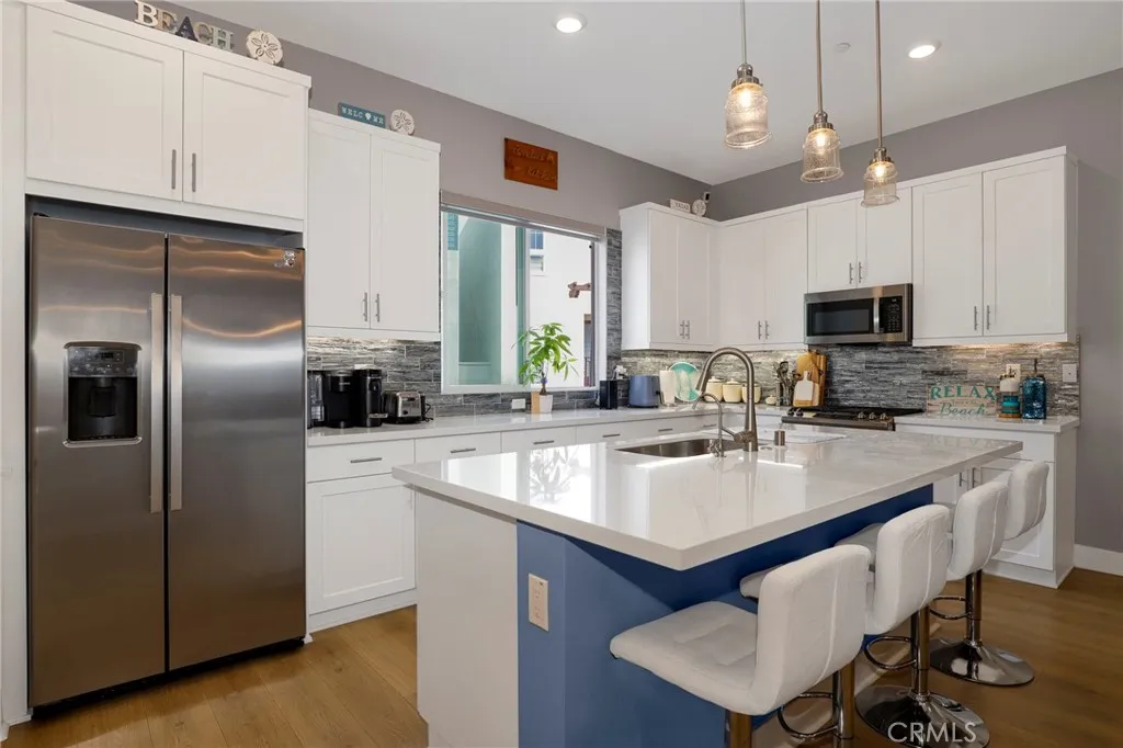 Nestled within the highly desirable gated Ponte Vista Master-Planned Community of Coastal San Pedro, 1642 W Saratoga Lane is a top of the line Plan Three, 4 Bedroom and 3.5 Bath, 1873SF Tri Level Luxury Home and offers the perfect blend of modern design, thoughtful upgrades, and a vibrant coastal lifestyle. This beautifully enhanced and upgraded residence combines comfort and sophistication with over $45,000 in owner improvements, making it truly move-in ready. Step inside to find a custom painted designer interior that compliments the homes bright and inviting layout. The kitchen has been updated with a new designer tile backsplash, quartz countertops, spacious center island with seating for 4 bar stools, white shaker cabinets, stainless steel appliances, chic pendant lighting & pantry. The upgraded living room light fixtures set the tone for stylish open entertaining with outdoor covered patio for BBQ! The bathrooms have all-new lighted mirrors, modern glass shower doors, and a newly installed full size vanity in the mid level power room, adding both function and elegance. Upstairs, the primary suite shines with updated lighting, custom closet organizers, and new roller window blinds throughout for a polished and tailored feel. Luxurious shiplap accent walls in two upstairs primary bedroom suite and lower junior suite which brings warmth and coastal flair to the sleek design. Durable LVP laminate flooring on the lower staircase and throughout the main level enhances the homes flow, while stackable washer and dryer closet on the main level and thoughtful custom storage sol