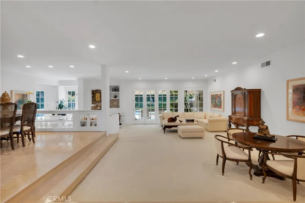 Wonderful, mid-century, ranch-style, 5 bed, 3.5 bath, over 3700 sqft home set on an expansive 16,228 sqft lot in quiet residential neighborhood in Northridge blends timeless architecture with spacious comfort. Great curb appeal with A-frame roofline, white brick panels, wide drive with brick ribbons, circular walkway, and manicured green lawn framed by hedges and shade tree. Elegant double doors open into a formal entry and open, inviting home, with tasteful and elegant touches like parquet floors, crown molding, high ceilings, and recessed lighting throughout. Formal sunken living room is a bright and airy space, perfect for entertaining and gatherings with French doors to the patio, and open flow to the dining area and sunken conversation pit. Dining room showcases a wide archway, lighted cabinetry, and passthrough to the conversation pit, which features a marble-surround fireplace, wet bar, and built-in shelves for display. Expansive, informal family room offers built-in shelving, French doors to the yard, and a pass-through to the bright eat-in kitchen. Kitchen boasts white cabinetry, white appliances, granite counters and backsplash, and a cozy breakfast nook. A powder bath and dedicated laundry room add convenience, while a nearby private bedroom with adjacent bath is perfect for guests or a home office. Down the hall, the primary suite impresses with double-door entry, mirrored walk-in closet with custom built-ins, generous space with room for a sitting area and French doors to the backyard. The en-suite, spa-style bath offers heated tile floors, marble counters, be