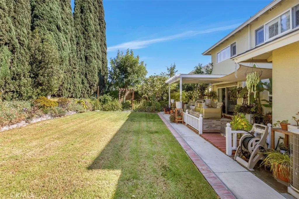 Welcome to this stunning two-story Mid-Century Ranch-style residence, ideally situated in a highly sought-after neighborhood within a top-rated school district. With inviting curb appeal, a spacious three-car garage, and a thoughtfully designed layout, this 5-bedroom, 3.5-bath home offers the perfect balance of comfort and sophistication. Step inside to a welcoming foyer that opens to a bright and airy living room, complete with a beautiful fireplace, custom built-in display cabinetry, and a large picture window that floods the space with natural light. The main level features a primary suite with direct backyard access through expansive sliding glass doors, while upstairs includes an additional en-suite bedroom along with generously sized rooms ideal for family, guests, or a home office. The bathrooms have been tastefully updated with dual sinks, modern tile shower stalls, and a relaxing whirlpool bathtub. A separate laundry room adds convenience and functionality. The gourmet kitchen showcases granite counters, stainless steel appliances, and ample cabinetry, seamlessly flowing into the dining area with sliding glass doors that open to the backyard. Step outside to private retreat where a beautifully landscaped backyard provides tranquility and space for gatherings. Mature fruit trees, lush plantings, and vibrant gardens surround multiple outdoor living areas, including a built-in BBQ, shaded patio, and cabana-style seating - perfect for entertaining or unwinding in total privacy. This exceptional property blends timeless Mid-Century charm with modern upgrades, offering a