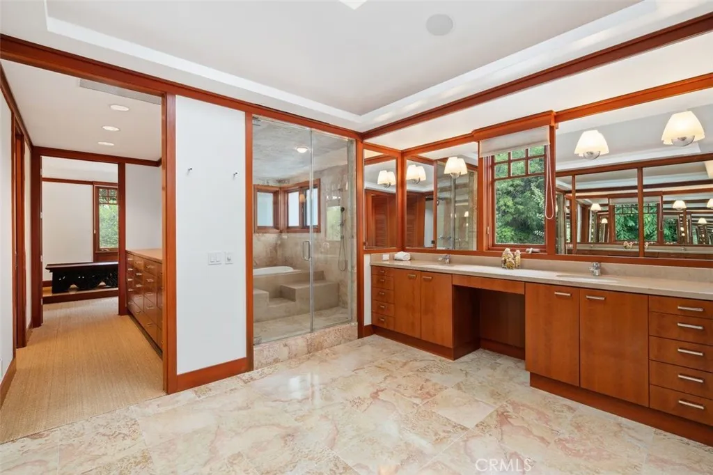 This stunning custom-built contemporary estate masterfully blends American and Chinese traditions, designed by renowned Beverly Hills designer Luis Ortega and architect Steven Ehrlich. The home is set on beautifully landscaped grounds with imported trees and plants, a serene pond, built-in BBQ, covered patio, patterned stone steps, moss beds, and enchanting mountain views, complemented by expansive frontage and a 5-car garage. A grand double-door entry leads to a dramatic foyer with rich hardwood floors and mullioned windows, while interiorsdesigned with Feng Shui principlesshowcase modern simplicity and elegance. Features include a gourmet kitchen with high-end appliances and a separate wok kitchen, a formal dining room, intimate inglenook, media room, home office, den, indoor exercise pool, and a guest suite on the main level. The Zen-inspired master suite offers a retreat area, walk-in closets, panoramic-view deck, and a luxurious spa bath with limestone tiles and custom shower walls. Genuine mahogany wood throughout enhances the sense of warmth and refinement, making this one-of-a-kind estate a true masterpiece of cultural fusion, elegance, and quality craftsmanship.