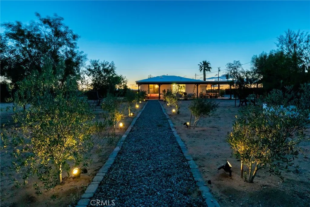 This FULLY FURNISHED 3-bedroom, 2-bath rustic-modern compound rests on 3.51 acres in scenic Joshua Tree. Set on the mesa and fully fenced for privacy, the property offers sweeping views of the surrounding hills and mountains along with a tranquil desert atmosphere. Thoughtfully renovated, the home features polished concrete floors, white wood-paneled walls, skylights, and sliding glass doors in the bedrooms that fill the interiors with natural light. The open-concept kitchen, ideal for entertaining, includes a large island, sleek black cabinetry and fixtures, granite countertops, and a tile backsplash. The adjoining living area with large slider overlooking the backyard is enhanced by vaulted ceilings and exposed beams. Both bathrooms have been stylishly updated with tiled walk-in showers and contemporary lighting. Comfort and efficiency are ensured with Mitsubishi mini splits, upgraded electrical, a new water heater, and full gutters. Outside, a generous covered patio invites relaxation and gatherings, accented with rattan light fixtures and black-and-white Aztec tile at the entry and steps. A detached cedar shed with a covered porch, dedicated power, vinyl flooring, extra fridge, and lighting offers versatile use as an art studio, office, or yoga space. The property also includes an RV electrical hookup, ample parking, and a Tuff Shed for added storage. The L-shaped lot features paved road frontage and a side gate off Shifting Sands Trailperfect for a potential second dwelling with private access. Outdoor highlights include two water meters, a pool with custom wood deckin