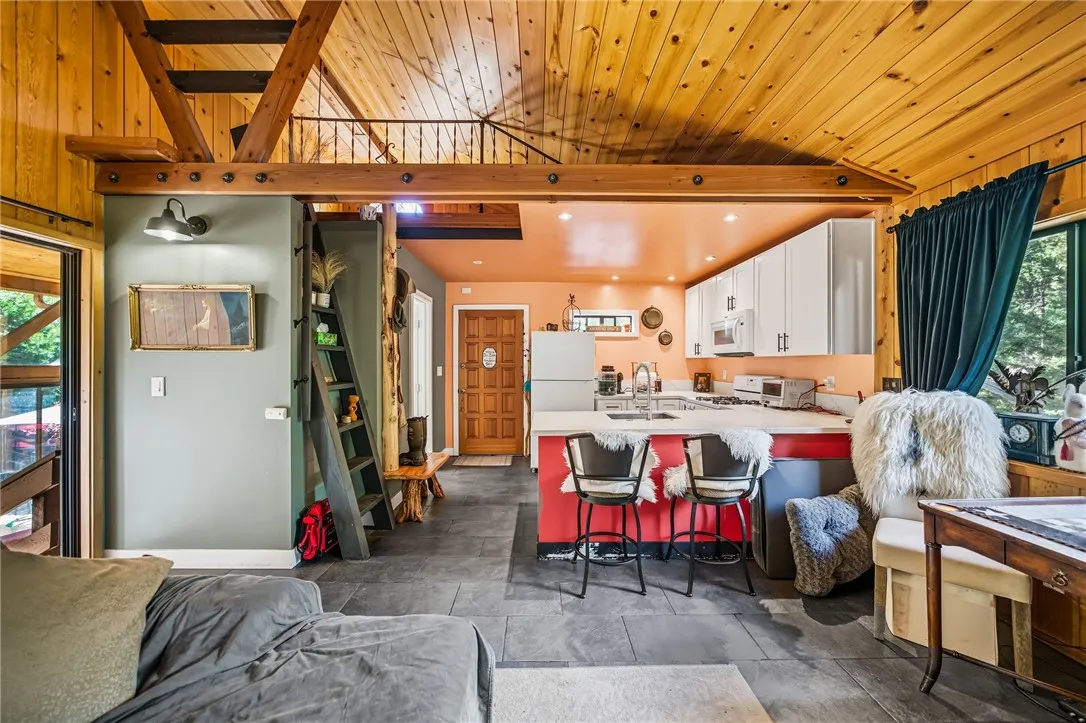 Discover a truly enchanting mountain retreat at 25106 Rim Rock Rd, nestled in the serene Fern Valley of Idyllwild. This exceptional property offers two remodeled, rustic modern cabins on a spacious .51-acre lot, providing the perfect escape for the entire family. The main cabin is a charming 3-bedroom, 1.75-bath home featuring vaulted and beamed ceilings that create an airy, open feel. The living room, with its cozy brick fireplace, flows into the dining area and an updated kitchen complete with stunning waterfall-edge counters and ample cabinetry. Sliders from each bedroom bring the fresh mountain air indoors. Step outside and you'll find a truly magical guest house with 2 bedrooms, 2.75 baths, and a sleeping loft, perfect for hosting guests or a rental. An incredible atrium floods the space with natural light and opens to an oversized backyard where you'll discover a whimsical mushroom play structurefun for all ages! The property also includes an outbuilding for storage, a 1-car garage, and breathtaking views of Suicide and Lily Rocks. Both homes have been thoughtfully updated with a new 40-year roof on the main house, new electrical panels, updated septic systems (two septic tanks, one for the front house, one for the back), and air conditioning. Additional upgrades include a tankless water heater, new decks and railings, and a host of other improvements that make this a turnkey property. Don't miss this opportunity to own a one-of-a-kind Idyllwild gem!