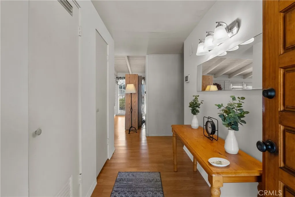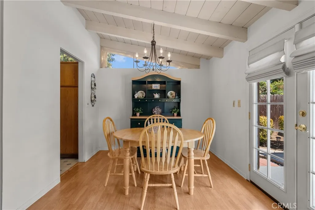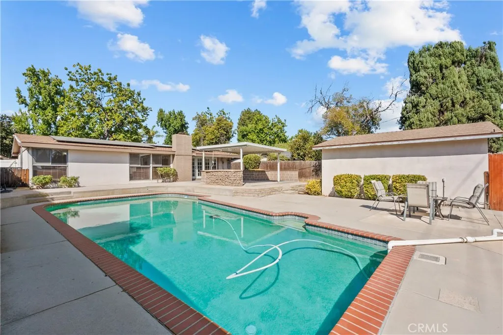 Welcome to this charming Palmer and Krisel mid-century modern, located in the highly sought-after North Hills West neighborhood. Blending timeless architectural appeal with modern updates, this four-bedroom, two-bathroom residence offers 1,344 square feet of bright, open living spaceperfect for both everyday comfort and effortless entertaining. Upon entry, you're greeted by a light-filled foyer that opens into expansive common living and dining areas. Signature vaulted wood-beam ceilings, abundant natural light, a cozy wood-burning fireplace, and French doors create a warm and inviting atmosphere. Oversized sunlit windows offer views of the private backyard and sparkling swimming pool, beautifully merging indoor and outdoor living. The spacious primary bedroom features vaulted ceilings, ample closet space, and an en-suite bathroom with a tiled shower-over-tub combination. Three additional bright and generously sized bedroomseach with vaulted ceilings and ample closet spaceshare access to a full bathroom and a separate three-quarter bath with a tiled stall shower and vanity. One of the bedrooms includes private access to the front courtyard, making it an ideal space for guests, an in-law suite, or a dedicated home office. At the heart of the home lies the well-appointed cooks kitchen, featuring classic tile countertops, an electric oven and range, generous cabinetry, vaulted ceilings, and a convenient indoor laundry area. Just off the kitchen, the dining room provides an ideal space for everything from casual family breakfasts to formal gatherings. Step outside through Frenc