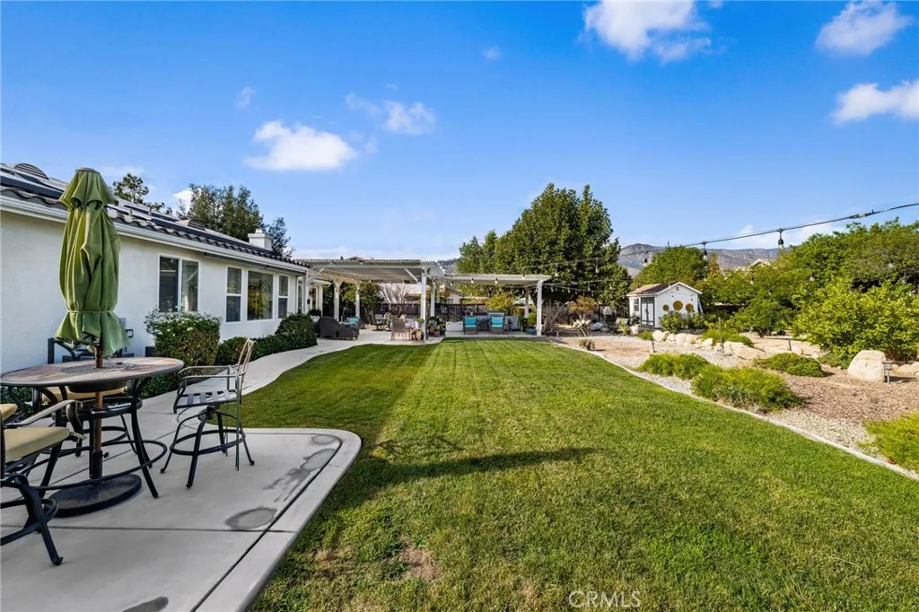Welcome home to this beautifully maintained single-story retreat tucked at the end of a quiet cul-de-sac, where neighbors still wave hello and life feels a little slower without sacrificing convenience. Set on nearly half an acre of flat, fully usable land, this 4 bedroom (plus an office), 3 bath home offers over 3,100 square feet of living space designed for gathering and everyday comfort. Inside, youll find soaring ceilings, rich millwork framing every window and doorway, and timeless Quartzite flooring flowing through the main living areas. The remodeled kitchen is the heart of the home, with an oversized island, sunny breakfast nook, crisp white cabinetry, quartz countertops, and stainless steel appliances opening seamlessly to the family room with fireplace. The spacious primary suite features a coffered ceiling, backyard access, dual vanities, soaking tub, and walk-in closet, while the secondary bedrooms are generously sized, including a guest wing with remodeled bath and walk-in shower. Thoughtful details continue throughout, from built-in cabinetry in the garage to upgraded baseboards, wood flooring, and custom carpets. Step outside and discover an entertainers dream yard, complete with an expansive covered patio, BBQ island with sink and fridge, and multiple seating areas shaded by mature trees, including ten fruit trees and more than thirty others planted for beauty and privacy. Enjoy lemon, lime, orange, pomegranate, grapefruit, and fig, plus fragrant rosemary bushes. The manicured grounds are ready to enjoy today, yet the flat lot also offers incredible potentia