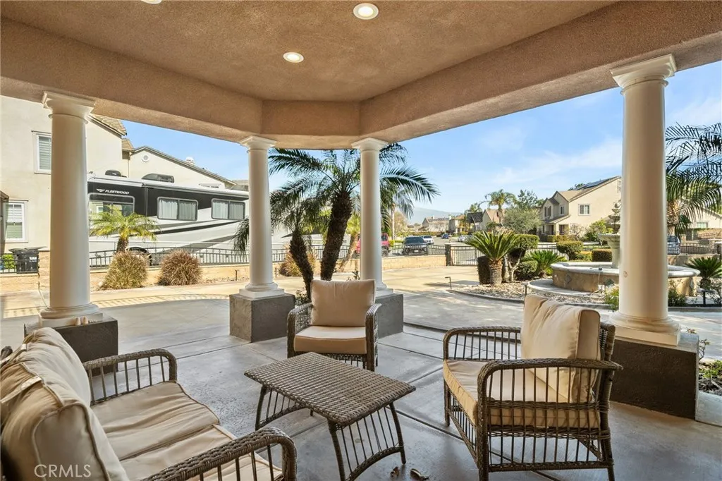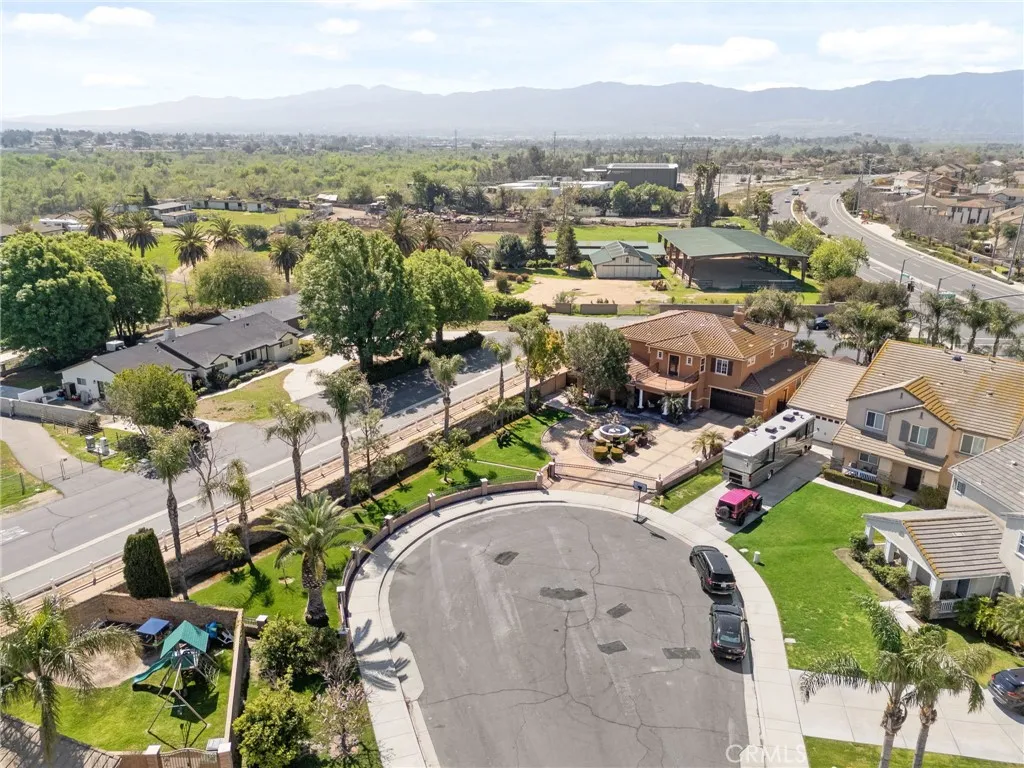 Welcome to this stunning, turnkey, one of a kind home located in the highly sought-after River Glen community of Eastvale. Situated on a spacious 13,068 sq. ft. lot at the end of a peaceful cul-de-sac, this well-maintained residence offers a blend of elegance, comfort, and practicality. With 5 bedrooms, a loft, and 4.5 bathrooms, this home is designed for family living and entertaining. The grand entrance features a circular driveway with a beautiful fountain, providing additional parking for over 8 cars alongside the 4-car garage, totaling over 12 parking spaces! The front yard is beautifully landscaped and securely gated with a combination of block and wrought iron fencing, creating a private oasis with stylish light fixtures and an automatic gate for added security. Relax and enjoy breathtaking views of the city lights and surrounding hills from the custom, oversized balcony and patio, perfect for outdoor gatherings. The backyard is designed for easy maintenance, featuring artificial grass, and offers ample space to build a pool, allowing you to customize your outdoor retreat. Inside, you'll find real wood flooring throughout, complemented by crown molding and plantation shutters on every window. The open-concept living areas are ideal for entertaining, while the spacious primary suite offers a relaxing sanctuary with a cozy sitting area, private balcony, a soaking tub and separate shower, and 2 separate, generous walk-in closets. The downstairs suite has its own en suite bathroom, separate from the guest bathroom. Additional highlights include a convenient upstairs laun