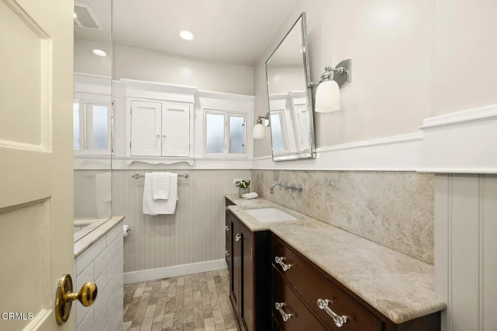 Charming 1914 Craftsman nestled in the heart of South Pasadena. This beautifully maintained home blends timeless charm with thoughtful modern updates. Set behind a welcoming covered front porch, this two-story residence invites you in with a warm and open layout, perfect for both everyday living and entertaining. Step inside to a spacious living and dining room adorned with gleaming hardwood floors, a cozy brick fireplace, wainscoting, and classic picture molding that exude historic character. The central hallway leads to a convenient laundry room and a remodeled kitchen, complete with built-in appliances and stylish finishes. The kitchen opens seamlessly into a generous step-down family room, highlighted by a second brick fireplace and a wall of glass doors that offer views and access to the oasis-like backyard. The first floor is complete with three comfortable bedrooms a remodeled 3/4 bath and laundry room, ideal for guests or a growing family. Upstairs, escape to a tranquil primary suite boasting vaulted ceilings, dual closets, and its own wall of glass doors leading to a picturesque balcony--a perfect spot to enjoy your morning coffee. The luxurious ensuite bath includes dual vanities and elegant finishes throughout. Step outside into the lushly landscaped backyard, designed as a private retreat. At the heart of the garden is a burbling fountain, surrounded by fruit trees and a peaceful seating area ideal for relaxing or entertaining. A detached 2-car garage and additional 1-car carport provide ample parking and storage. Located in the award-winning South Pasadena scho