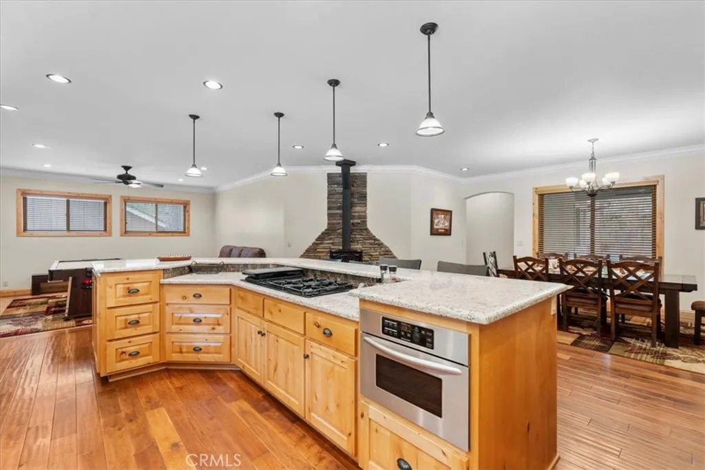 As you wind your way up Heavenly Valley Road, towering pines frame the path and fresh mountain air sets the tone. This gracious single-level home sits on a nearly 12,600 sq ft forested lotsprawling yet warm, spacious yet inviting. A wide driveway offers extra parking and leads to the attached 3-car garage. Step inside to a light-filled foyer accented with warm wood tones. The formal living room features a cozy fireplace, wood-accented ceiling, and sliding doors opening to the patio. The kitchen is a true centerpiece, with granite countertops, custom backsplash, state-of-the-art appliances, pendant lighting, and a large island with seating. Open to the dining area and family room with its own fireplace, the layout is ideal for gatherings. Offering 4 bedrooms and 3.5 baths, this home blends comfort and function. The primary suite is a retreat with direct backyard access, a large walk-in closet, and a spa-inspired bathroom with jetted tub and dual vanities. Secondary bedrooms are generously sized, including one with a private half bath. A separate laundry room and wood-burning stove add convenience and charm. Step outside to a peaceful backyard with an outdoor fireplace, patio space, and beautiful landscapingperfect for entertaining or simply enjoying the mountain air. Built in 2006 and immaculately kept, this home combines mountain character with modern amenities. The location is unbeatablejust 3/4 of a mile to Snow Summit and less than 2 miles to the lake, Village, Bear Mountain, golf, and the zoo. Heavenly Valley Estates living at its finestdont miss this opportunity to own