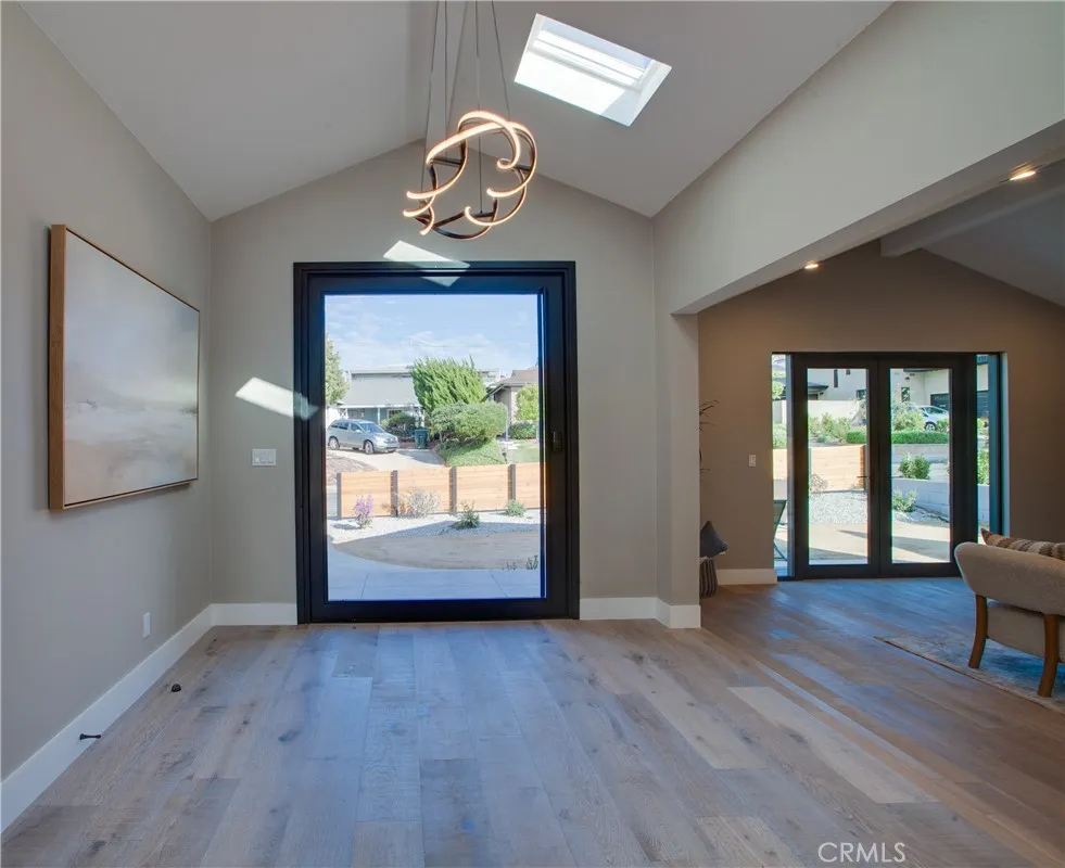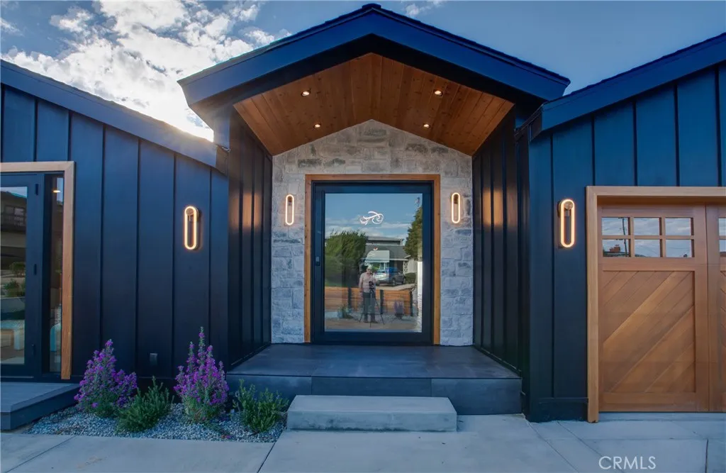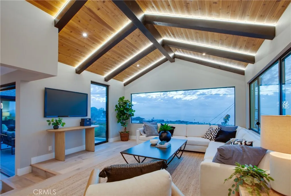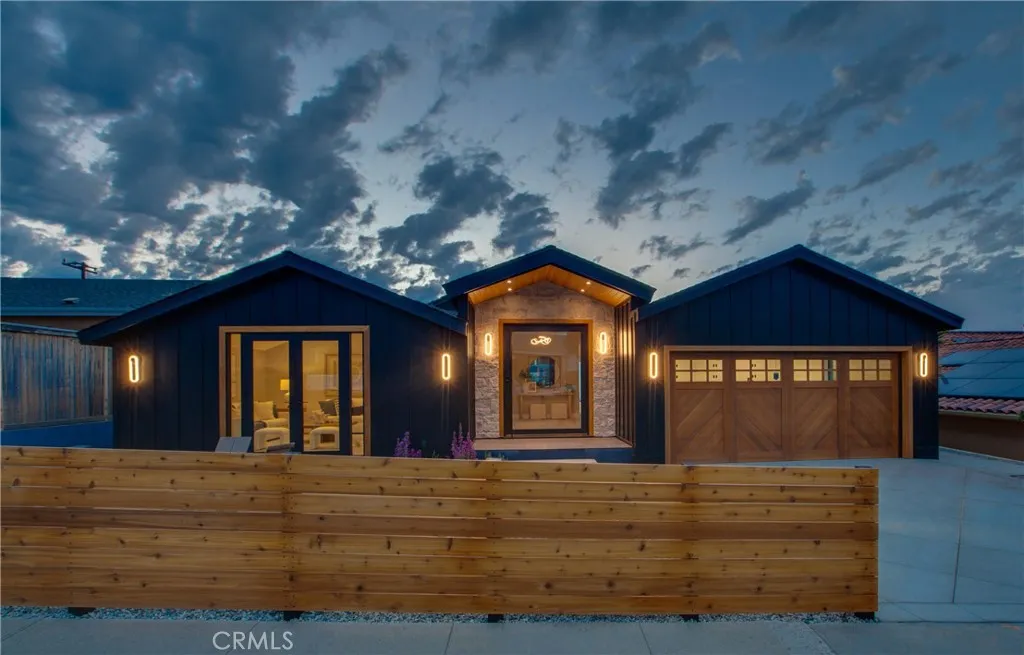 A Contemporary coastal ranch with modern farmhouse elements. The dark vertical siding paired with warm wood garage doors and trim provides a strong contrast and upscale curb appeal; Linear sconces add modernity and make the exterior glow at dusk, emphasizing architectural lines. A new horizontal cedar fence frames the lot, blending with the wood tones of the home. Minimalist landscaping (gravel, succulents, and low-water plants) suits a coastal climate and low-maintenance lifestyle. This coastal luxury retreat in the Hollywood Riviera has been newly reimagined to blend modern design with timeless finishes, offering three bedrooms and three bathrooms across an open floor plan filled with natural light. Sweeping ocean and sunset views define the living experience, with expansive picture windows and sliding glass doors connecting every major space to the outdoors. The rear living room is the architectural highlight, featuring vaulted ceilings with exposed wood beams and custom integrated LED lighting that accentuates the dramatic wood-plank detail overhead. A seamless flow leads into the dining area and designer kitchen, where quartz counters, premium stainless steel appliances, custom cabinetry, and an oversized island create a stylish and functional space for both entertaining and everyday living. The private master suite opens directly to the deck and includes a generous walk-in closet and a spa-style bath with dual vanities, modern tilework, and a walk-in shower. Two additional bedrooms and two full baths provide flexibility for guests, family, or office use. Outdoor livin