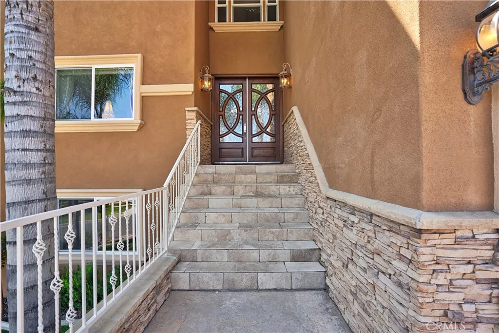 Welcome to this custom Mediterranean tri-level home in the coveted Canyon Lake community. Offering 5 bedroomseach with its own private bathroom and walk-in closetthis 3,505 sq ft residence is situated on an 8,276 sq ft lot designed for elegance and easy living. From the moment you arrive, the curb appeal captivates with Mediterranean architecture, a 3-car epoxy-finished garage (including RV/golf cart space), lush palms on auto-drip, and astro turf with decorative rock for a true island vibe and low-maintenance lifestyle. A limestone-trimmed travertine staircase leads you to custom beveled glass double doors. Inside, soaring 19' ceilings and a stunning diamond-pattern travertine foyer welcome you into the grand great rooman open living and kitchen space designed for entertaining. The family room features a wood-burning fireplace, wet bar with wine refrigerator, custom shelving, all flowing seamlessly into a wow-factor chefs double granite island Kitchen with stainless steel appliances to include: dual ovens, microwave, dishwasher, refrigerator, and dual sink. This dream entertaining kitchen is also well equipped with a walk-in pantry, side door to the epoxy-poured garage, and breathtaking backyard views. Step outside to a private retreat with a covered patio, gazebo, a new fountain, shed, and terraced garden spaces framed by astroturf and retaining wall with side yard ladder access to the fruit trees. The main level primary suite offers peaceful community views, a walk-in closet, and a spa-inspired bathroom with travertine finishes, tub/shower, and glass-enclosed walk-in sho