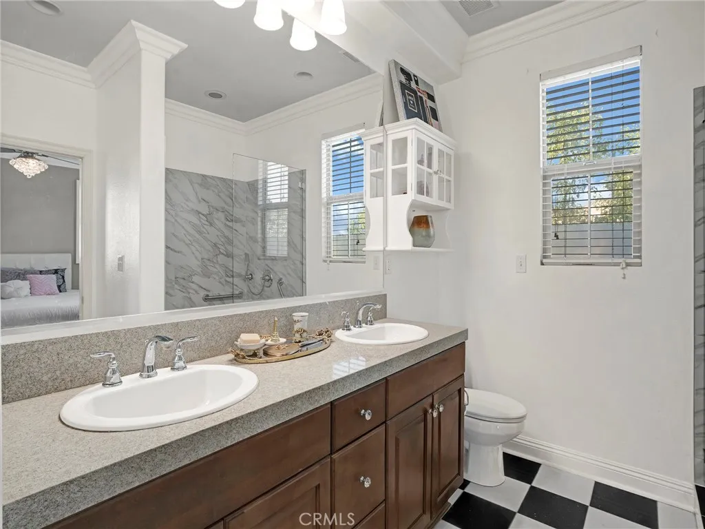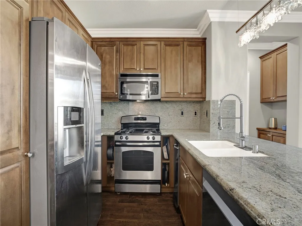 PORTER RANCH | Rare, updated waterfront unit in the coveted guard-gated Aldea community. This home is one of only a handful positioned in a serene setting, next to lush landscaping and soothing sounds of a cascading waterfall. From the moment you enter, the checkered tile flooring in the foyer sets a sophisticated tone. The first level features direct access to a 2-car garage, a dedicated laundry room with built-in storage, and a welcoming entryway. Upstairs, the layout unfolds beautifully, showcasing crown molding, hand-scraped hardwood flooring, plantation shutters and high-end light fixtures. To the right, a generously sized secondary bedroom and full bath provide comfort, privacy and flexibility. Straight ahead, the open-concept living space is drenched in soft, natural light and is a seamless blend of kitchen, dining, and family room that opens to a private patio. The kitchen is thoughtfully upgraded with granite countertops, stainless steel appliances, and abundant cabinetry. Privately tucked away at the far end of the home, the corner primary suite offers a peaceful retreat with mountain views. The fully remodeled en-suite bathroom features a spa-inspired shower, creating a luxurious escape, with endless hot water from the newer tankless unit. Living in Aldea means enjoying resort-style amenities: a sparkling pool, relaxing spa, BBQ area, and beautifully landscaped grounds. All this and just minutes from The Vineyards at Porter Ranch, top-rated schools, scenic hiking trails, and convenient freeway access. Dont miss your chance to own one of Aldeas rare waterfront gem