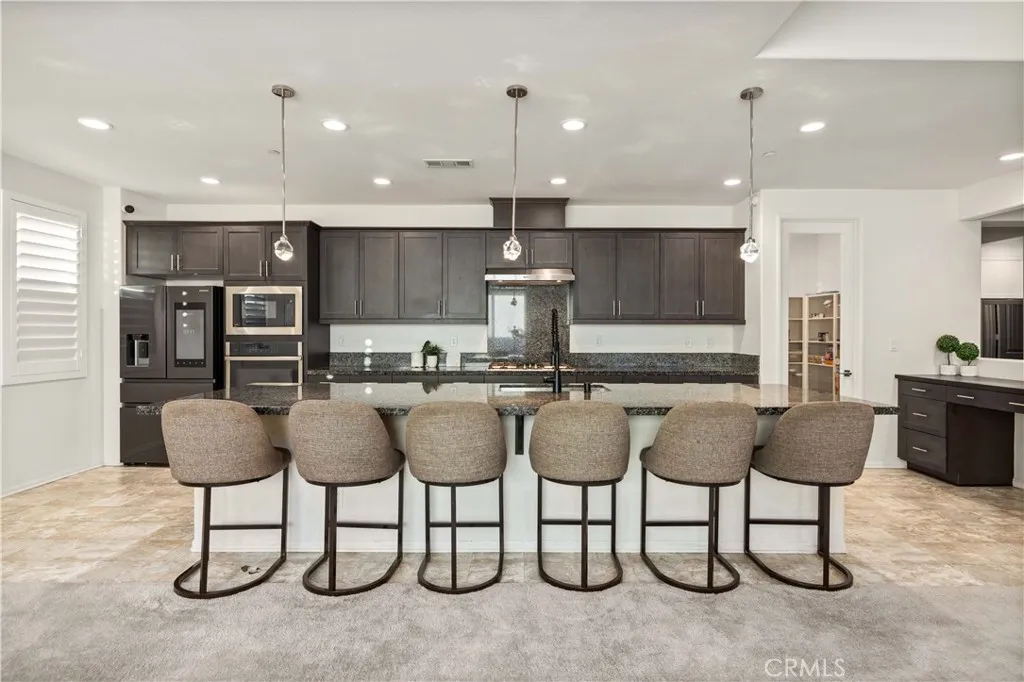 This beautiful 4 bedroom, 4 bathroom single story home offers PAID OFF SOLAR, over 3,000 sqft of living space, and sits on a spacious 7,851 sqft lot in a clean, newer community with no HOA! Built in 2021, this property combines desert modern design with top-of-the-line smart home features and energy efficient upgrades throughout. As you pull up, you're welcomed with gorgeous curb appeal featuring a stone-accented exterior, beautiful drought-tolerant landscaping, an elegant custom front door, and custom-lit concrete stairs that lead you right to the entry. There's also a cozy seating area in the front yard, perfect for enjoying your morning coffee while taking in the peaceful sunrise. Inside, you're greeted with high ceilings, large windows that allow an abundance of natural lighting, and a bright, open floor plan that flows perfectly from the kitchen to the family room, perfect for entertaining guests! The kitchen features granite countertops, stainless steel appliances, a large island with bar seating, beautiful pendant lighting, a walk-in pantry, and shaker cabinets with plenty of storage. The spacious family room is complete with a sleek gas fireplace, built-in Sonos ceiling speakers, and smart blinds that work with the smart home system. Just off the kitchen, you'll find a large formal dining area that's currently being used differently, but offers plenty of room for a full dining setup and is equipped with smart blinds as well. All four bedrooms are generously sized and each offers either a private or nearby bathroom, plus walk-in closets! The primary suite is tucked a