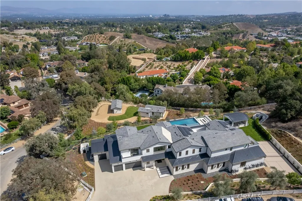 Panoramic views and curated design define this gorgeous, newly constructed estate, nestled at the end of a quiet cul de sac and sited on a large private lot within the guard-gated community of Hidden Hills. Perfectly positioned to capture the sweeping pastoral and city light views, this custom-built residence delivers a seamless blend of elevated architecture and indoor-outdoor living. The sunny, open floor plan centers around a stunning chef's kitchen with oversized island, prep kitchen, and counter seating that flows into the dramatic great room, anchored by a two-sided fireplace & sliding walls of glass that frame the endless views. Designed for grand scale entertaining and everyday comfort, the home features a spacious game and recreation room, custom home office, dedicated wellness wing with gym, steam room & sauna, a plush home theater with fabric covered walls, a sleek lounge with wet bar, and a glass encased, refrigerated wine cellar. Both levels include an additional den or flex spaces, and all six ensuite bedrooms are thoughtfully designed, connected by a floating architectural staircase and serviced by an elevator. The luxurious primary suite is a true retreat, complete with fireplace, stone-wrapped spa bath with steam shower, boutique sized custom closet, and a large, wraparound balcony with commanding views. The estate comprises four distinct structures. In addition to the main residence, which includes garages for seven cars with custom epoxy floors, the grounds feature a pool pavilion complete with a built-in barbecue and pool bath, a detached 965 square foot