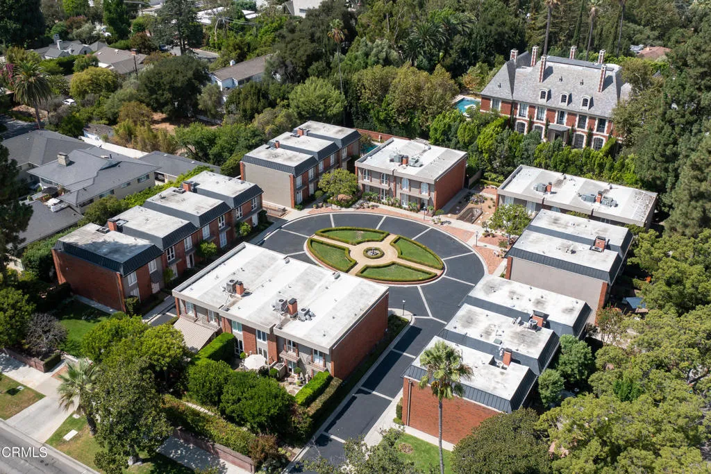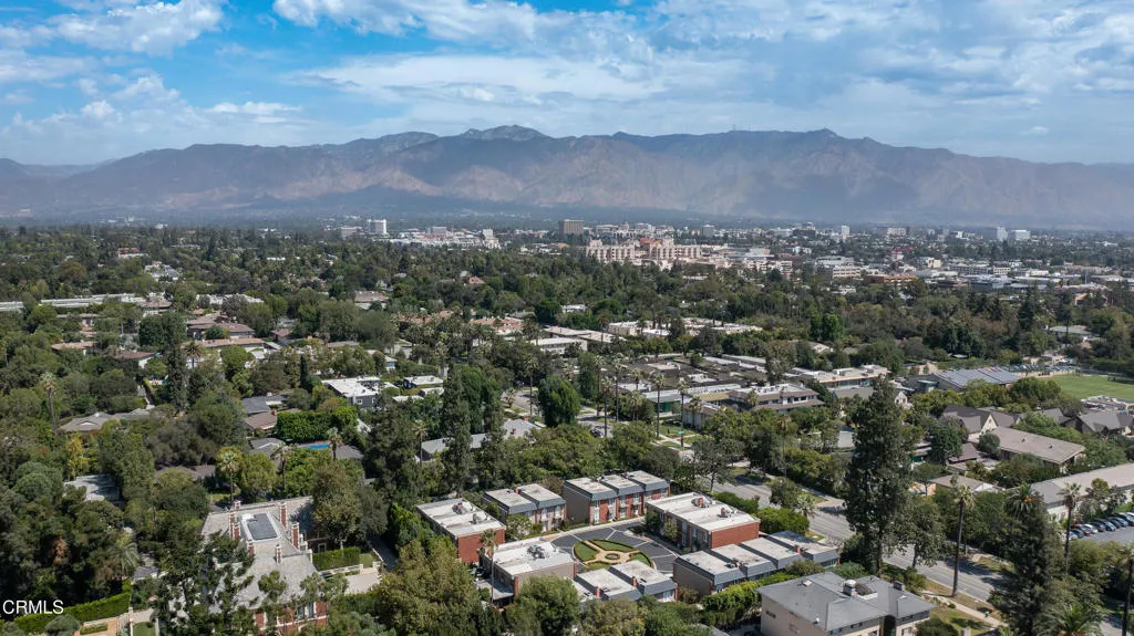 Sophisticated living within Pasadena's desirable Craven's Court along famed Millionaire's Row, this exceptional end-unit residence boasts one of the most coveted floor plans in the enclave, offering both scale and privacy with only one shared wall. From the moment you arrive, the frosted glass double-door entry welcomes natural light into a refined interior where herringbone hardwood floors, recessed lighting, and thoughtful details set the tone. Just off the entry, a versatile bedroom or office space with a closet and an adjacent guest bath provides function and flexibility. The main level flows seamlessly with a stylish wet bar connecting to the gourmet galley kitchen, featuring stone countertops, custom tile backsplash, a Zephyr range hood, JennAir refrigerator, and the kitchen's centerpiece, a Bertazzoni 5-burner cooktop and oven, regarded as the 'Ferrari' of ranges imported from Italy. A swinging door opens to the dining area, continuing into the spacious living room with crown molding, a fireplace, and direct access to a tranquil private patio with lush greenery and the soothing sound of a fountain. Upstairs, both bedrooms are private suites. The guest suite includes French doors with louvered shutters opening to dual balconies overlooking the patio, generous closet space, and a stone-topped vanity in the ensuite. Across the landing, the primary suite offers crown molding, custom built-ins, abundant closet space, and a spa-like bath with a stone vanity, a glass-enclosed shower, and luxurious finishes. Additional conveniences include a laundry closet, attic storage, an