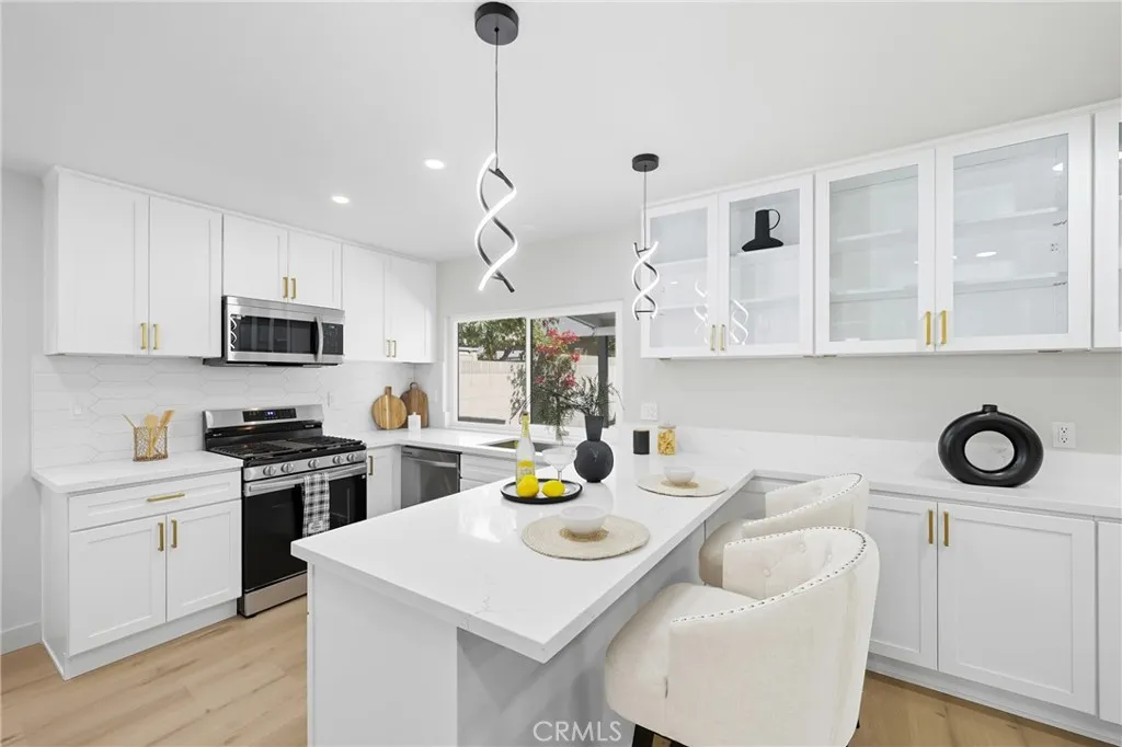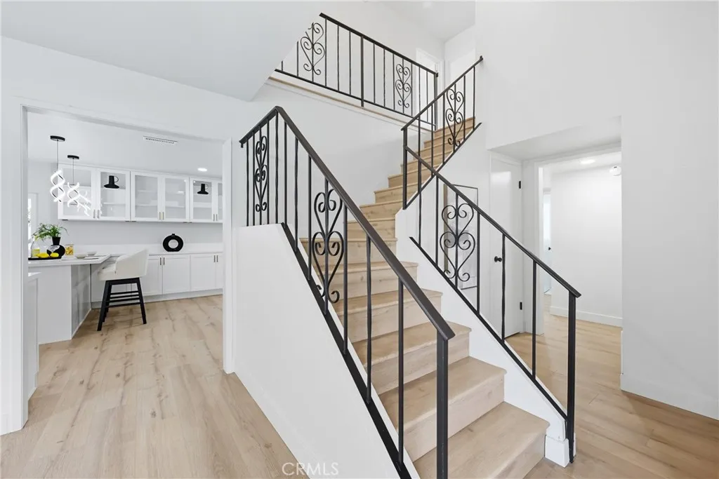 Welcome to this beautifully remodeled 5-bedroom, 3-bathroom gem in La Palma, ideally situated on a generous lot at the end of a peaceful cul-de-sac! Nestled in a highly desirable neighborhood with no HOA, this move-in-ready home seamlessly blends modern comfort with timeless style and thoughtful upgrades throughoutall FULLY PERMITTED and approved per city codes for peace of mind. Step inside to soaring ceilings at the entrance, where a formal living room with an upgraded fireplace sets the tone for the homes inviting warmth. The entry also features a smart lock for modern convenience and security. The open-concept chefs kitchen shines with brand-new quartz countertops, custom cabinetry, and premium appliancesa perfect combination of function and elegance. The dining area flows effortlessly from the kitchen and features custom glass cabinetry for an added touch of sophistication. Convenience abounds with a full bedroom and full bathroom downstairs, ideal for multigenerational living, guests, or a private home office. Upstairs, youll find four spacious bedrooms and two fully remodeled bathrooms, offering comfort and privacy for the entire household. This smart home offers modern automation features, including occupancy sensors in all bathrooms, brand-new central AC and heating, and double-pane windows and sliding door for maximum energy efficiency, quiet living, and year-round comfort. Additional upgrades include fresh premium interior and exterior paint, around 55 new recessed lights, high-end flooring throughout, and LED mirrors in all bathrooms for a sleek, contemporary to
