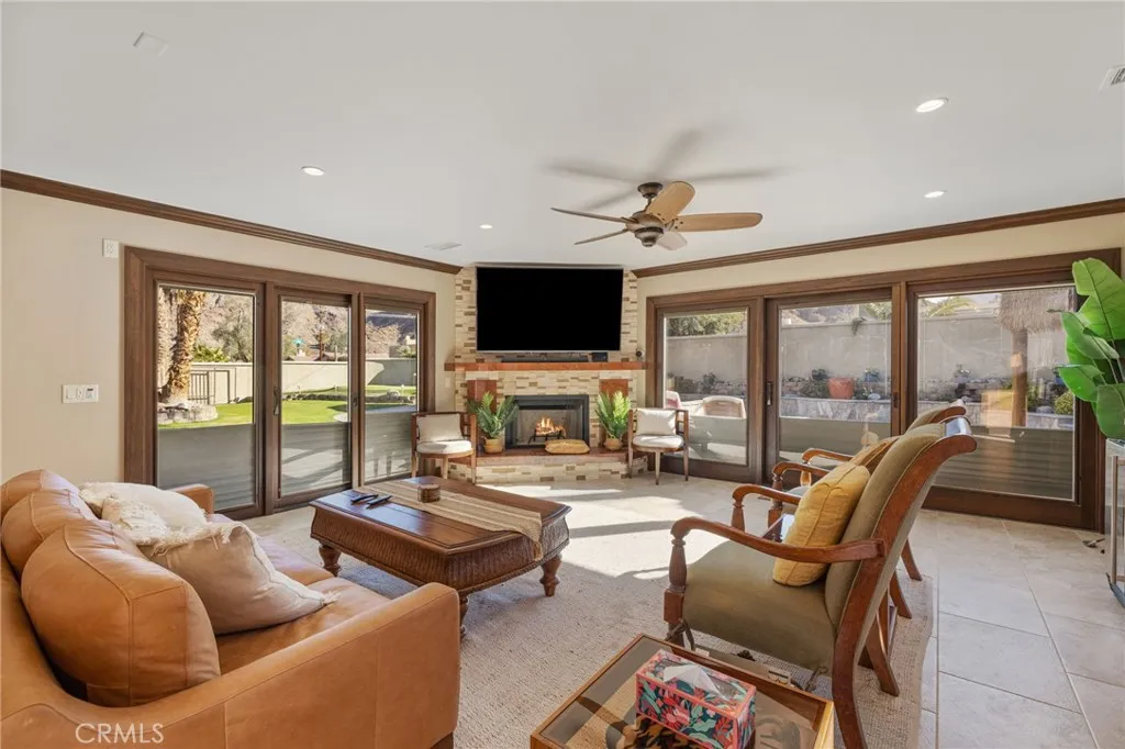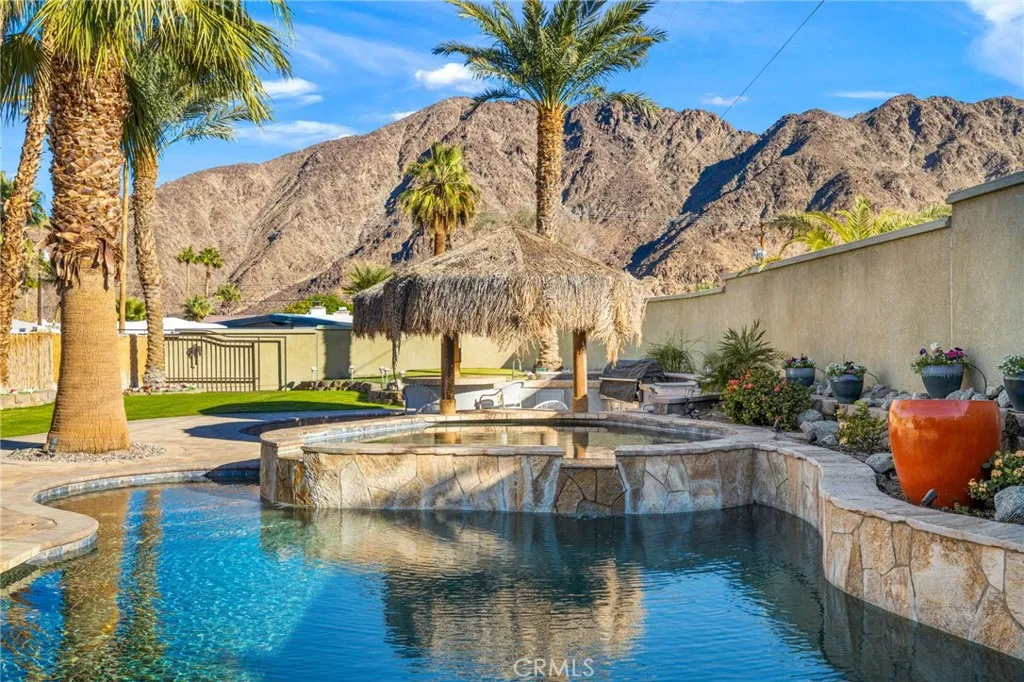 Stunning Desert Resort Style Home with Scenic Mountain Views! This beautiful 4 bedroom and 3 bath home features an indoor-outdoor living space that integrates its natural landscape and mountain views with comfortable living. The home features an open floor plan, a modern chef-inspired kitchen with granite countertops, stainless steel appliances, inviting french doors facing the pool area with mountain views and a gas fireplace. This home has three remodeled bathrooms, three guest rooms, a primary bedroom with ensuite bathroom, a guest room with ensuite bathroom, indoor laundry and a 2 car garage. The outdoor living space has a relaxing salt water pool, large spa with bar area, well equipped outdoor kitchen for cooking and entertainment, a putting green, a fire pit for cozy nights and a tall stucco wall surrounding the property for privacy. There's NO HOA dues and the property is nestled within La Quinta Cove foothills just minutes from Old Town La Quinta, restaurants, shops and the Cove Walking Trails.