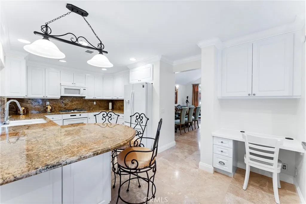 Absolutely Stunning 4-Bedroom Home in the Sought-After La Tierra Tract of Rancho Santa Margarita! Welcome to this beautifully upgraded residence nestled within the desirable Tijeras Creek Golf Course neighborhood. This exceptional home showcases tons of upgrades, including the addition of a spacious fourth bedroom upstairs and newer luxury vinyl flooring on the upper level. Step into the elegant living and dining rooms featuring soaring vaulted ceilings, travertine flooring, 6-inch baseboards, and double doors that open to a serene side courtyardperfect for outdoor dining or a morning coffee. The entry greets you with a Spanish-style wood door with a speakeasy, setting the tone for the homes timeless character. The remodeled kitchen is a true centerpiece, boasting granite countertops and backsplash, white cabinetry, a Bosch dishwasher, a cozy breakfast nook, and a charming Dutch door leading to the backyard. The adjacent family room offers a welcoming fireplace with a wood mantel and large windows that fill the space with natural light. Downstairs also features a tastefully updated powder room and a convenient laundry room with direct garage access. Ascend the custom wood and wrought-iron staircase to discover a luxurious primary suite with vaulted ceilings, a walk-in closet, and a spa-inspired ensuite with dual quartz vanities and a travertine walk-in shower. Three additional bedrooms and an upgraded full guest bath complete the upper level. Step outside to your private backyard oasis featuring a covered patio, built-in BBQ island, synthetic turf, custom hardscape, and lus