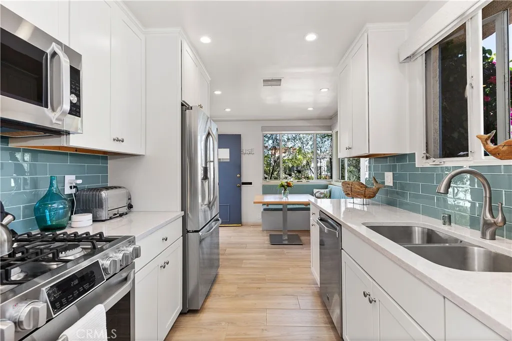 Located in the heart of Naples Island, this pristine 2 bed, 2 bath beach house offers the perfect blend of classic character and modern comfort. Originally built in 1949 and thoughtfully remodeled throughout, the home showcases mid-century design elements, including beamed and vaulted ceilings in the living room and a dramatic stacked-stone fireplace. A private courtyard entry opens to a beautiful outdoor entertaining space, seamlessly connected to the light-filled interior through French doors and a wall of windows. The updated kitchen features stainless steel appliances, custom backsplash, quartz countertops, and a charming built-in banquette dining nook. Both bathrooms boast custom tiled showers, and the two spacious bedrooms include a serene primary suite with attached bath. Move-in ready and just steps from the canals, shops, and diningthis is the ideal coastal retreat!