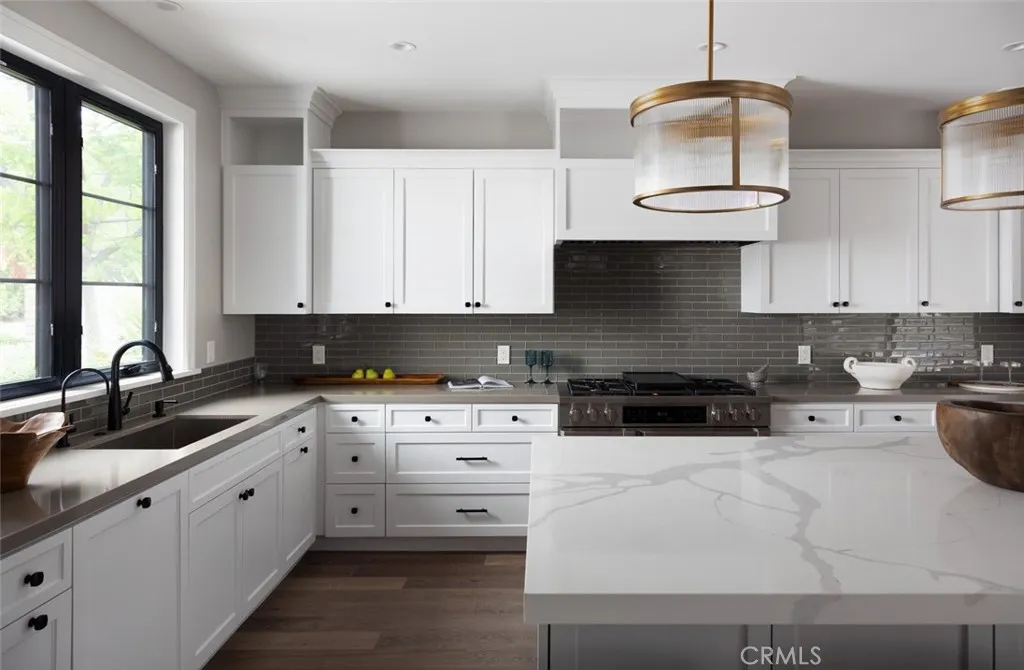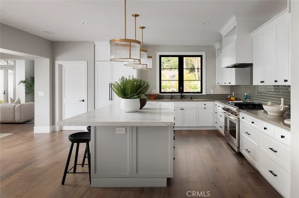 Newly rebuilt in late 2022 from the studs out and completely reimagined and expanded, this fabulous new home in Villa Park is truly unparalleled. Move-in ready, the residence offers the rare and enviable combination of newer construction in an established neighborhood, with mature landscaping and a prime corner homesite of about .46 acres adding to its undeniable appeal. Bathed in natural light that shines through an abundance of large windows, the open design showcases a foyer and living room with double-height ceilings, a contemporary staircase and a lofty interior balcony above. The grand dining room is certain to be a favorite place to share memorable occasions, and it opens to the backyard, creating a seamless indoor/outdoor vibe. Equally open and stylish, the on-trend kitchen displays white Shaker cabinetry, a large island with bar seating, quartz countertops, subway tile backsplash, a stainless steel pro-caliber range, and a built-in cabinet-matched refrigerator. The kitchen flows effortlessly to a family room that is distinguished by a high ceiling, backyard access, and a stone fireplace flanked by custom built-in shelving and cabinetry. Sophisticated and modern, the homes aesthetic is embellished with warm white and gray hues, wood-plank flooring and chic LED lighting. Five bedrooms plus office/gym and four and a half baths are featured in approximately 4,005 square feet, including ensuite bedrooms, a main-level bedroom, an office, and an upscale-modern primary suite with a vaulted ceiling, freestanding tub, separate shower and two sinks. Grounds are impeccable, wi