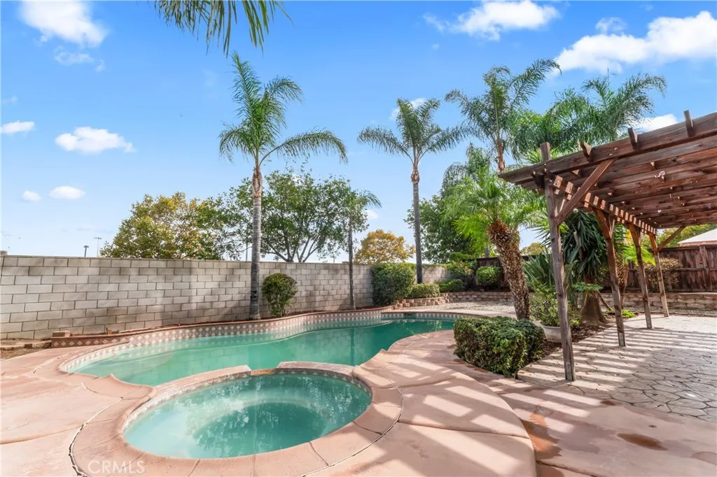 Spacious 5 bed, 3 bath, 2 story home for sale in the popular neighborhood of Orangecrest! Kitchen open to dining and family room with floor-to-ceiling cabinets with pantry and a desk space, a farm sink, and island for added prep space. Fireplace in the family room. Additional living room in the front. Downstairs bedroom and 3/4 bath with walk-in shower. Primary upstairs suite with separate walk-in shower and tub, a massive two-sided walk-in closet, and double vanity with two sinks. Huge open loft upstairs with additional hall storage. Two sinks in hall bathroom shared between three additional upstairs bedrooms, one of which is extra large with two closets. Private pool, spa, and covered patio in a landscaped backyard. Trees surround the property for partial shade. Separate attached garages for a total of three covered parking spaces plus extra driveway space. Short walk to Orange Terrace Park and all sorts of dining and shopping options are a short drive away in all directions. No HOA and low taxes!