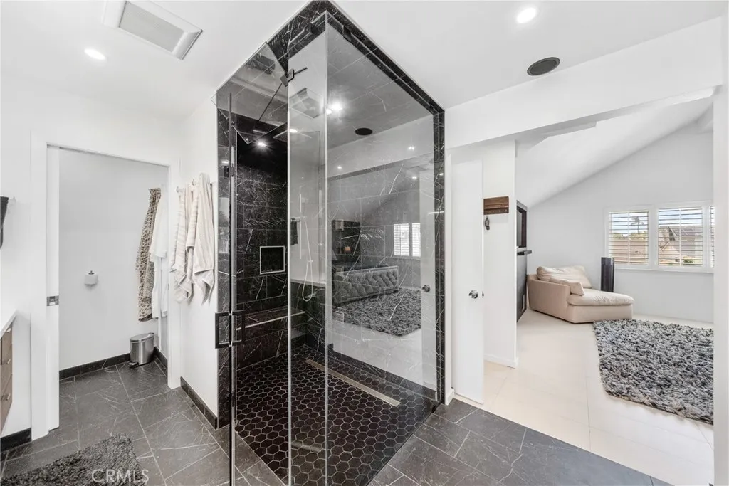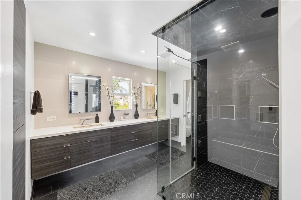 Welcome to this exceptional, renovated home blending high-end design, smart technology, and resort-style outdoor living. Located on a quiet interior street in the highly sought after Moffett tract, this home truly has it all. Every detail has been thoughtfully curatedfrom the reimagined front yard with lush landscaping, low-maintenance turf, new King palm, privacy fencing, and app-controlled irrigation systemto the stunning indoor and outdoor upgrades. The entry porch features stylish, no-slip tile, while the upgraded garage includes vinyl flooring, a smart door system, new water heater, and washer/dryer. Inside, the open-concept main level showcases heated Italian porcelain tile flooring and a show-stopping kitchen with a custom Italian quartz island, built-in convection oven, sensor glass cooktop, downdraft vent, microwave drawer, and sleek soft-close cabinetry in walnut and fingerprint-resistant gloss white. Under-cabinet LED lighting with app-controlled color options completes the modern aesthetic. Large sliding doors open to a true backyard retreat: a custom-built BBQ island with fridge, sink, gas grill, side burner, storage, ambient lighting, and two seating areas. Entertain with ease around the gas fire-pit or waterproof outdoor TV, or unwind in the state-of-the-art salt water pool and spa, featuring massage jets, a waterfall, Baja step, upgraded heater, and app-controlled lightingall surrounded by lush landscaping and a new brick paver patio with a cozy daybed. The main floor includes a bedroom and beautifully updated bathroom with white marble-look tile, matte blac