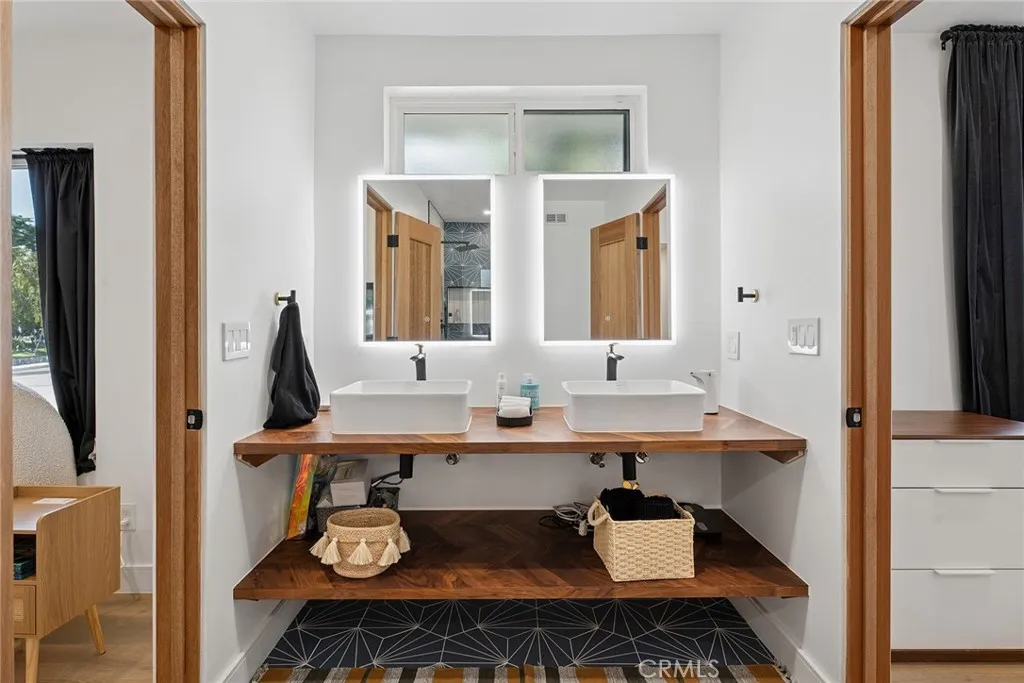 Gorgeous single story Mid-Century modern Charles Du Bois with newly built swimming pool and dazzling Valley, mountain, & city light Views! The property is situated at the very end of a quiet cul-de-sac West of Valley Circle on an expansive private lot. The home sits back from the street with large grass lawn & covered front porch adorned with natural stone & wood siding. Step through double doors into the entry foyer with custom wood accent wall, coat closet, & wide plank oak wood flooring found throughout. The entry opens directly to the oversized living & dining rooms each featuring vaulted wood beamed ceilings, double sided stone fireplaces, wood accent walls, & large glass sliders that open to the backyard for the perfect indoor/outdoor flow. The dining room additionally has a built-in bar with wine fridge & storage. The stunning chefs kitchen opens to all living spaces and boasts center island with Brazilian quartzite countertop, custom soft close white oak cabinetry, dimensional tiled backsplash, stainless appliances including a 48 range with double ovens & 6-burner stove + griddle, Fisher & Paykel fridge/freezer, and separate breakfast nook with glass slider that opens to a side patio perfect for sipping your morning coffee. The luxurious primary bedroom features high vaulted ceiling, venetian plaster accent wall, large glass slider that opens directly to the pool, spacious walk-in closet with built-ins, & en-suite spa bathroom with floating vanity, dual sinks, walk-in shower, soaking tub, & smart bidet toilet. Two secondary bedrooms are each well appointed with cust