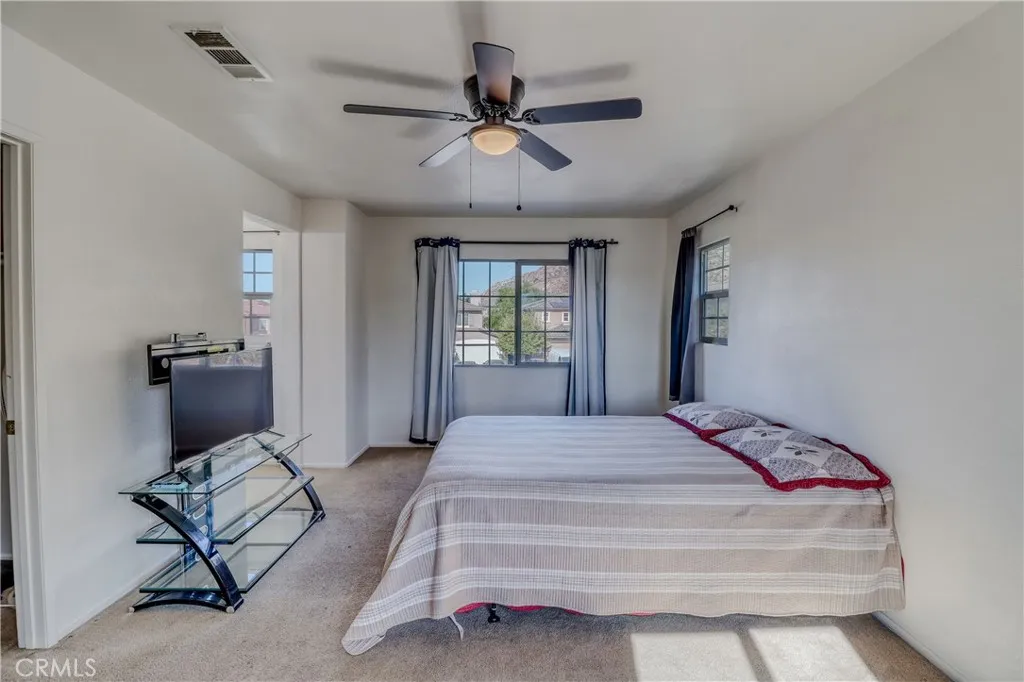 Looking for extra space or a potential 4th bedroom? This home features a versatile first-floor FLEX ROOM that can easily be converted into a guest room, office, or 4th bedroom offering flexibility for your lifestyle or future needs. Youll also benefit from 16 fully PAID-OFF solar panels, helping you save on energy costs from day one. Tucked away on a quiet cul-de-sac, this well-maintained property offers breathtaking city views from multiple angles and a spacious, open floor plan. Inside, youll find three full bathrooms and walk-in closets in every bedroom, with the primary suite offering dual sinks for added convenience. Other recent upgrades include a newer water heater, dual-pane windows, rain gutters, and a freshly painted exterior. Step outside to enjoy a 9-foot vinyl patio cover with two ceiling fans, perfect for relaxing or entertaining year-round. The tandem garage offers additional space for a third vehicle, a home gym, or extra storage. Conveniently located near top-rated elementary, middle, and high schools, Moreno Valley College, scenic hiking trails, and popular shopping centers. This move-in-ready home offers both comfort and functionality in one of Moreno Valleys most desirable neighborhoods. Schedule your private tour today!