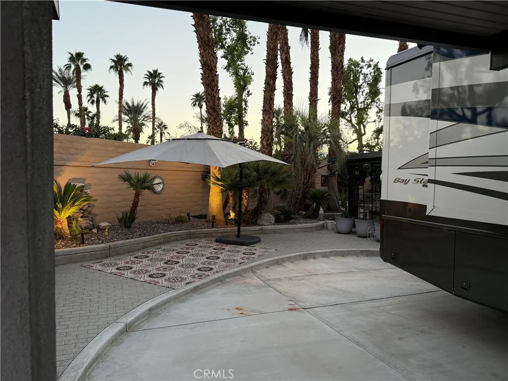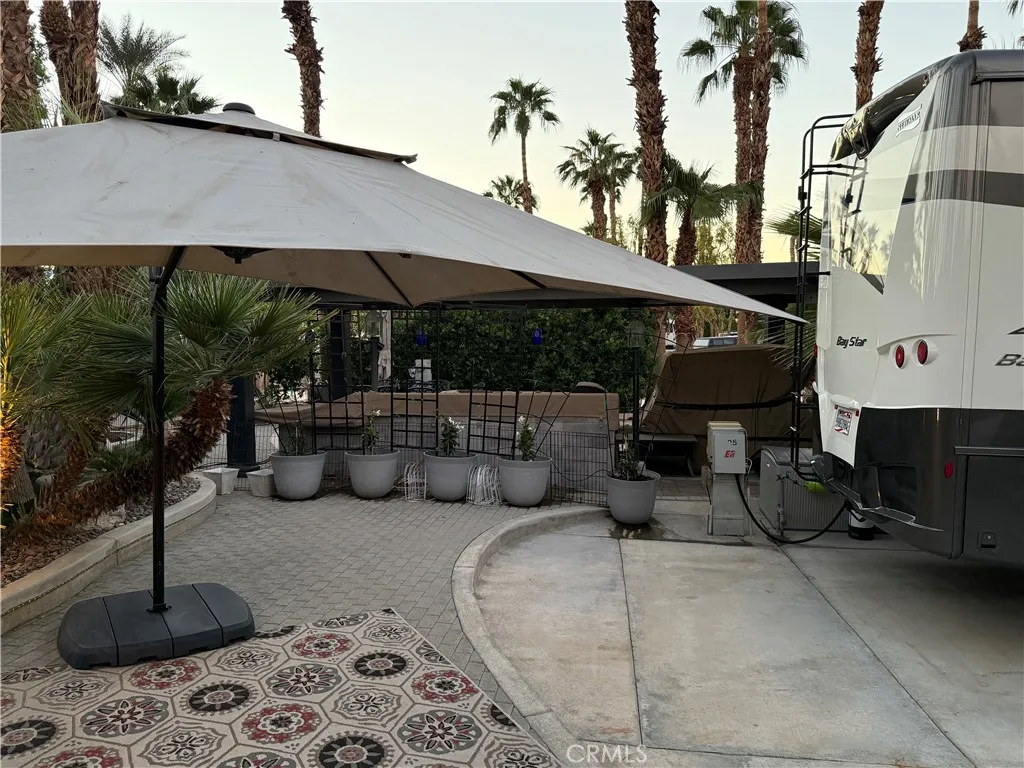 Welcome to Lot 125, a spacious and beautifully maintained site featuring a large shade structure ideal for outdoor living and entertaining. The lot is enhanced with decorative landscape lighting, adding charm and ambiance to your evenings. Conveniently located just steps from the pool and laundry facilities, this site offers both relaxation and easy access to amenities. Enjoy the resorts newly updated clubhouse, pickleball courts, golf course, and friendly community atmosphere the perfect setting for your desert getaway!