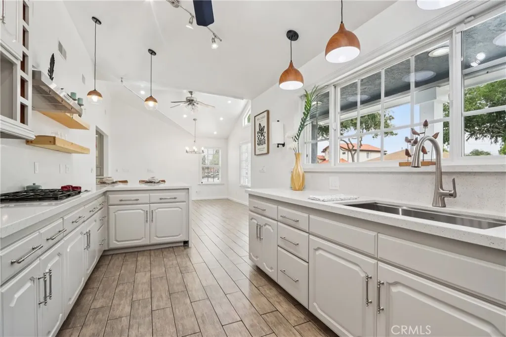 Imagine a single-level stunner with a designers touch. This 3-bedroom, 3-bath beauty will have you captivated from the curb. Stacked stone walls, meticulous dryscaping, and a wide front yard set the tone as you arrive on this picturesque, tree-lined street. A terraced pathway leads to the sizeable porch, ideal for showcasing seasonal decor or chatting with passersby. Inside, wide-plank floors stretch under vaulted ceilings, with recessed lighting and crisp white hues giving the home an effortlessly modern air. The flow is seamless between the sunlit living room illuminated by bright windows and a refined dining hall, where built-in display shelves, a tray ceiling, and a dry bar stand ready for intimate celebrations. Your kitchen is equal parts function and flair: track lighting spotlights every culinary move, and the luminous countertops shine beside stainless steel appliances and an oversized sink. A waterfall-edge multi-seater peninsula gleams beneath pendant lights, inviting conversation while delicacies take shape under diligent hands. In the generous step-down family area, skylights crown soaring ceilings, while an accent wall creates a counterpoint to sliding glass doors that frame the connection to a private oasis. Your entertainers backyard is a secluded haven, whether gathered under the gazebo beside the fire pit or enjoying quiet evenings sipping cocktails on the custom hardscaping bordered by living pathways. When its time to unwind, tranquility can be found in any of the well-proportioned bedrooms, each with a contemporarily designed bath conveniently at hand. D