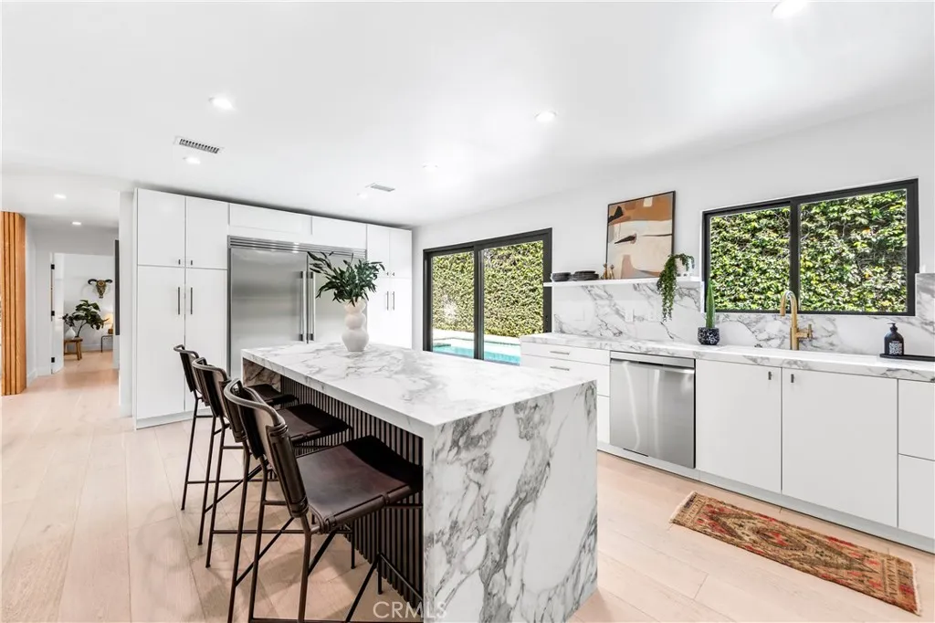 Creative, confident, and collected, this modern Seal Beach masterpiece reflects a refined coastal lifestyle. Step inside this stunning reimagined home where bold design meets relaxed living. Thoughtfully created for luxury and comfort, this residence blends clean modern lines, artistic details, and effortless indoor-outdoor flowjust minutes from the beach. A sleek charcoal exterior with board-and-batten detail, a dramatic entry and generous front patio sets the tone for the style within. Inside, soaring vaulted ceilings and wide-plank white oak floors create a gallery-like atmosphere, while curated statement piecessuch as the striking panther-print feature wallinfuse the home with personality and warmth. The open-concept living space is anchored by dramatic volume and abundant natural light. The designer kitchen features professional-grade appliances, oversized porcelain waterfall island, custom cabinetry, and walk-in pantry, making the space as functional as it is beautiful. Perfect for entertaining, the space opens seamlessly to the back yard retreat. The first floor also features a large dining room, a pool room/den/guest bedroom, a full bathroom, and a laundry room with direct garage access. Upstairs, the primary suite offers a tranquil retreat with a spa-inspired ensuite bath, complete with dual-sink vanity, oversized multi-head shower, and soaking tub. The large walk-in closet offers endless possibilities for customization. The two additional oversized bedrooms share a jack-and-jill bathroom. These spaces maintain the homes consistent blend of modern sophistication an