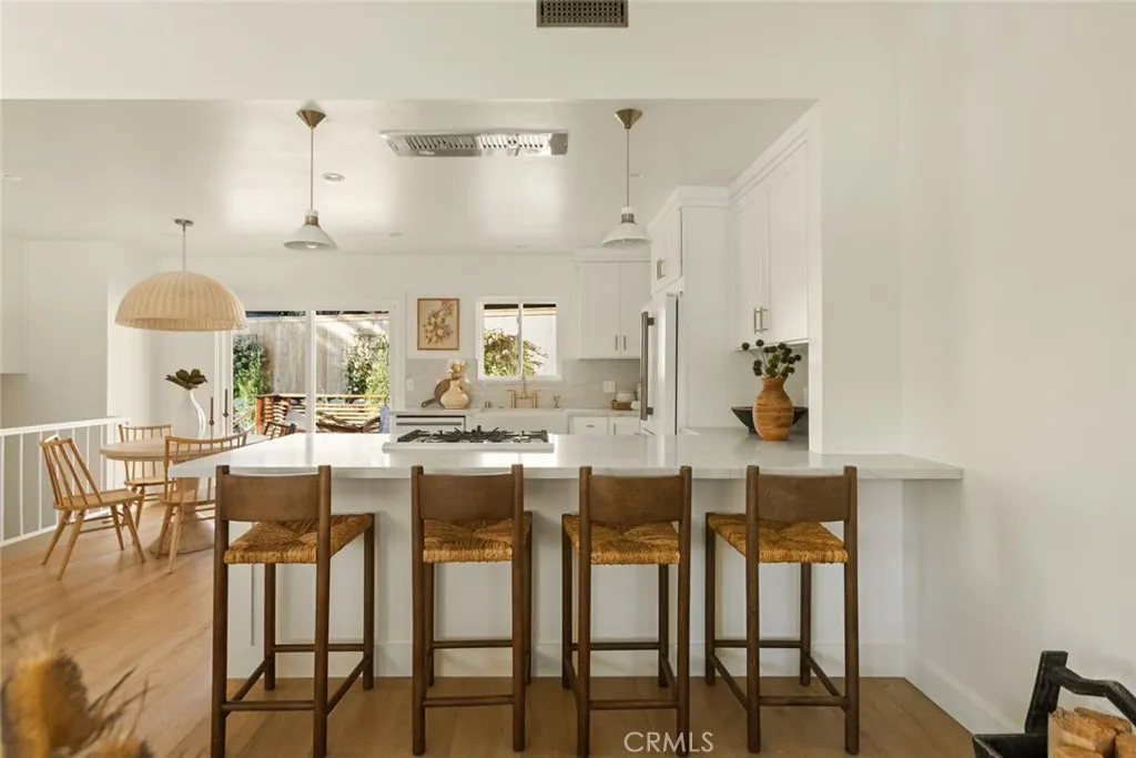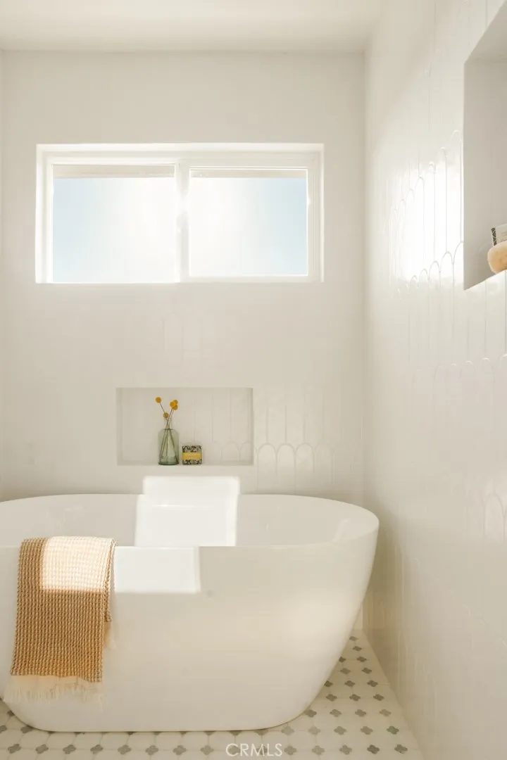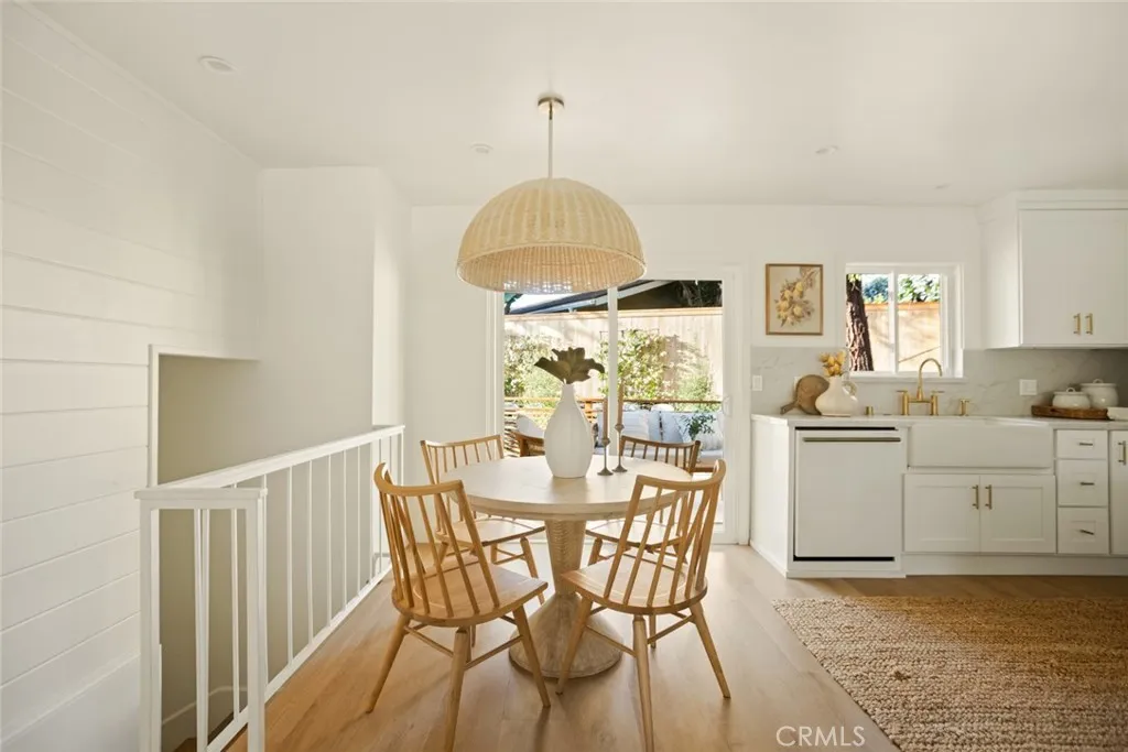 Endless charm and designer flair define this fully renovated 1960s coastal cottage in Dana Points coveted Palisades community of Capistrano Beach. Reimagined in 2025 by local designer Shannon Vandermeer of Vandermeer Designs, 27085 Calle Dolores offers 3 bedrooms and 2 bathrooms across 1,400+ square feet of thoughtfully curated living space. Every detail reflects quality and care, from designer finishes by Pottery Barn, West Elm, and Crate & Barrel to natural Zellige tiles, marble and quartz stone surfaces, and elegant brass fixtures. A storybook first impression begins at the curb with a sprawling front lawn, mature trees, spiral staircase, Willow Blue shutters, and a French-pane front door. Inside, vaulted wood-beam ceilings, luxury vinyl plank floors, and a quartz-surround fireplace with a wood mantel create a warm, inviting atmosphere. The stunning eat-in kitchen blends beauty and functionality with an oversized peninsula island, brand-new antique white Forno appliances, a patina brass faucet, farmhouse sink, and verdant garden views. The ensuite bedroom on the lower level features custom wardrobes, a shiplap accent wall, and direct access to the backyard. Its spa-like bath showcases Moroccan Zellige tile floors, a seamless scallop-tile shower, brass fixtures, and a dual-sink marble-top vanity from Pottery Barn. Upstairs, two spacious bedrooms offer ample closet space, designer lighting, and charming views; one with a private balcony overlooking the backyard and the other with treetop and peek-a-boo ocean vistas. A second designer bathroom impresses with mosaic marble t