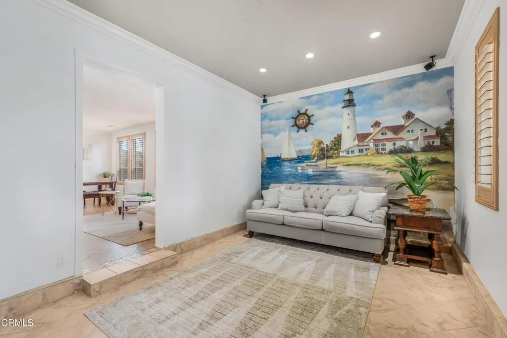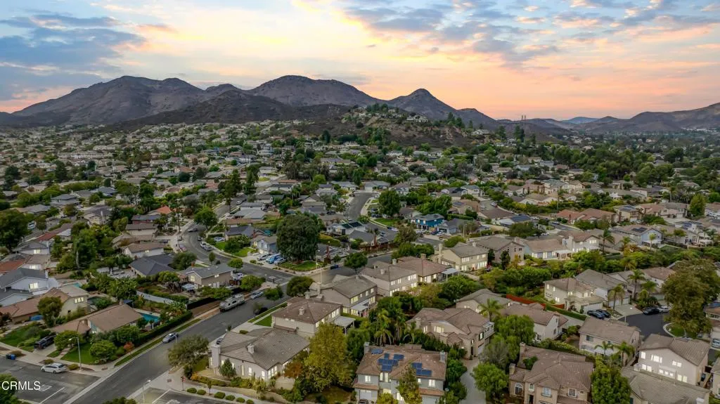 Welcome to this beautifully appointed 4-bedroom, 3.5-bathroom single-family home located in the heart of Newbury Park. Step through the front doors into a dramatic double-height foyer that flows seamlessly into a light-filled, open-concept living and dining area, perfect for both everyday living and sophisticated entertaining. Custom tile flooring and a grand chandelier set the tone for refined elegance. The formal living room features a cozy fireplace, while the expansive dining area, highlighted by a centered chandelier, provides ample space for memorable gatherings. The chef's kitchen is a dream, featuring abundant counter space and cabinetry, a center island, recessed lighting, built-in oven, microwave, and dishwasher. Adjacent to the kitchen, the inviting eat-in area perfect for your morning coffee. The warm and welcoming family room is complete with a stunning stone fireplace and lots of natural light. Also on the main level is a versatile bonus room, ideal as a home theater with surround system, home office, or game room, offering flexibility to suit your lifestyle. Upstairs, the plush, carpeted staircase is accented with custom wrought iron railings, guiding you to a spacious primary suite filled with natural light. Enjoy recessed lighting, a generous walk-in closet, and a luxurious ensuite bath featuring dual vanities, a large soaking tub, and a walk-in shower. Three additional well-sized bedrooms and a convenient upstairs laundry room complete the upper floor. Step outside to your private backyard oasis, perfect for year-round entertaining. Enjoy a sparkling pool,
