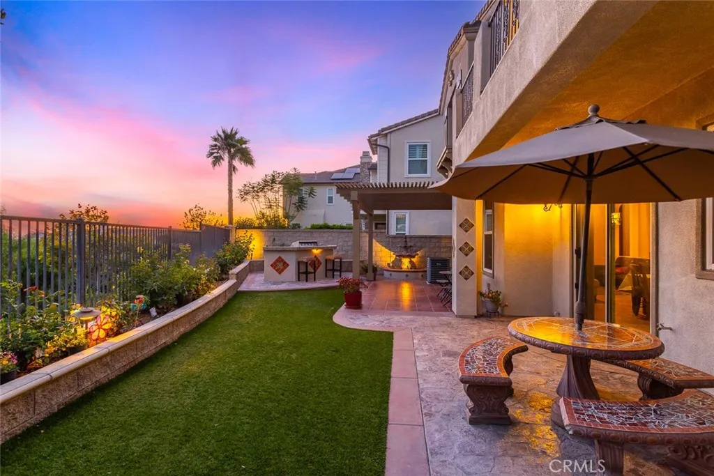 This turnkey estate, featuring distinguished Spanish architectural elements, is located within the prestigious Foxfield development of Vista del Verde. Model 2 offers a highly desirable floor plan with thoughtful upgrades that suit various lifestyles. The residence encompasses 3,920 square feet of living space, including four spacious bedrooms and two and a half bathrooms, as well as an attached GOUND LEVEL IN-LAW SUITE/CASITA (5TH Bedroom) with a private bathroom and separate entrance for added versatility. Upon entering the grand foyer, residents are welcomed by soaring vaulted ceilings and an open living room anchored by an arched gas fireplace with a pre-cast concrete mantel, surround, and hearth. Architectural highlights include dramatic ceilings, soffits, graceful arches, and a custom-crafted staircase with stained maple handrails and upgraded wrought iron balusters. The home features a large interior laundry room equipped with a deep sink and custom storage cabinetry. The gourmet kitchen is designed with a center island overlooking the dining area, extensive custom storage, a walk-in pantry, a five-burner cooktop with vented hood, double oven, built-in refrigerator, microwave, and dishwasher. The elegant dining room, bathed in natural light, is ideal for entertaining. Upstairs, the builder-option loft creates an inviting and flexible space suitable for a game room, office, study area, or home gym. The master suite includes a luxurious bathroom, private dressing area, walk-in closet, dual sinks, an oval soaking tub, and a separate walk-in shower. A walk-out balcony fr