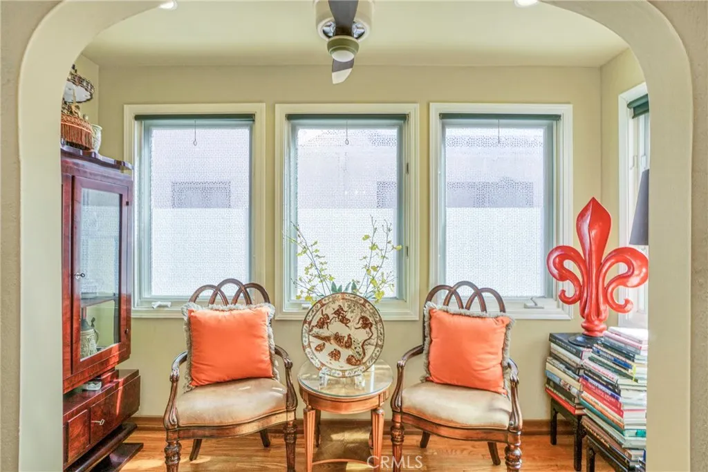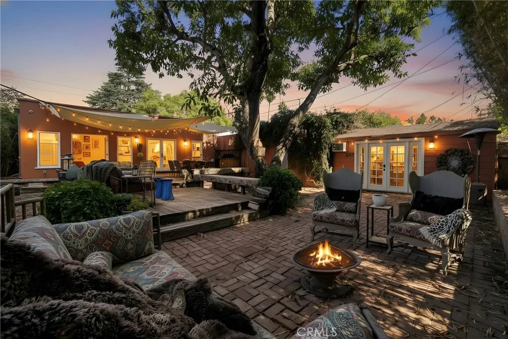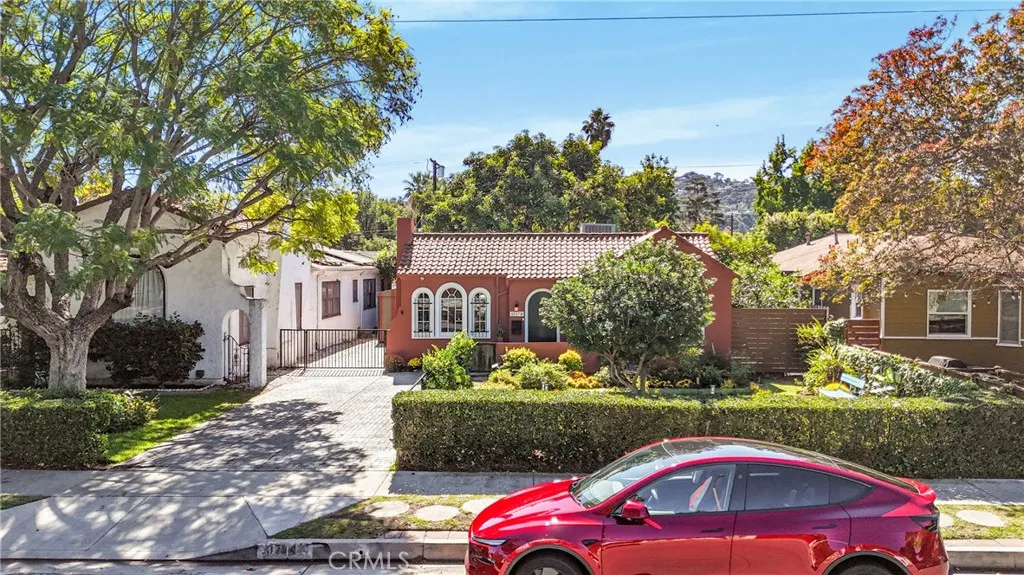 This 1925 Spanish-style artist retreat home blends original character with modern updates. The living room features an original California tile gas fireplace, vintage plaster walls, and original windows. The dining room connects to a small sunroom with casement windows. The kitchen is equipped with under-counter lighting, stove is dual fuel gas on top with electric oven, stainless steel appliances, butcher block and granite counters, and a built-in china cabinet in the breakfast nook. The home offers two bedrooms and two bathrooms with Cove ceilings in the living room and dining room. The guest bedroom has a vintage window, French door, and hardwood floors, while the primary bedroom provides backyard access and hardwood floors. The main bathroom has fresh paint and a cast-iron tub. Both bedrooms have ceiling fans, and the primary bedroom has 9-foot ceilings. With fresh interior and exterior paint, recessed lighting, and a new flat roof, this home also includes modern updates like a 2-ton AC unit with heat pump, 200-amp electrical service, newer plumbing, and a tankless water heater. A detached studio/office is attached to the single-car garage, which has extra storage space. The backyard features a inviting deck and brick terrace. This home is full of original charm and thoughtful updates, located in a fantastic area.
