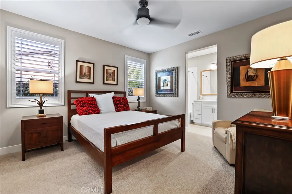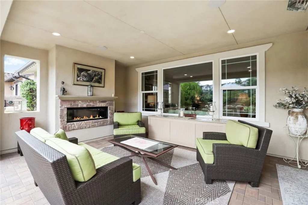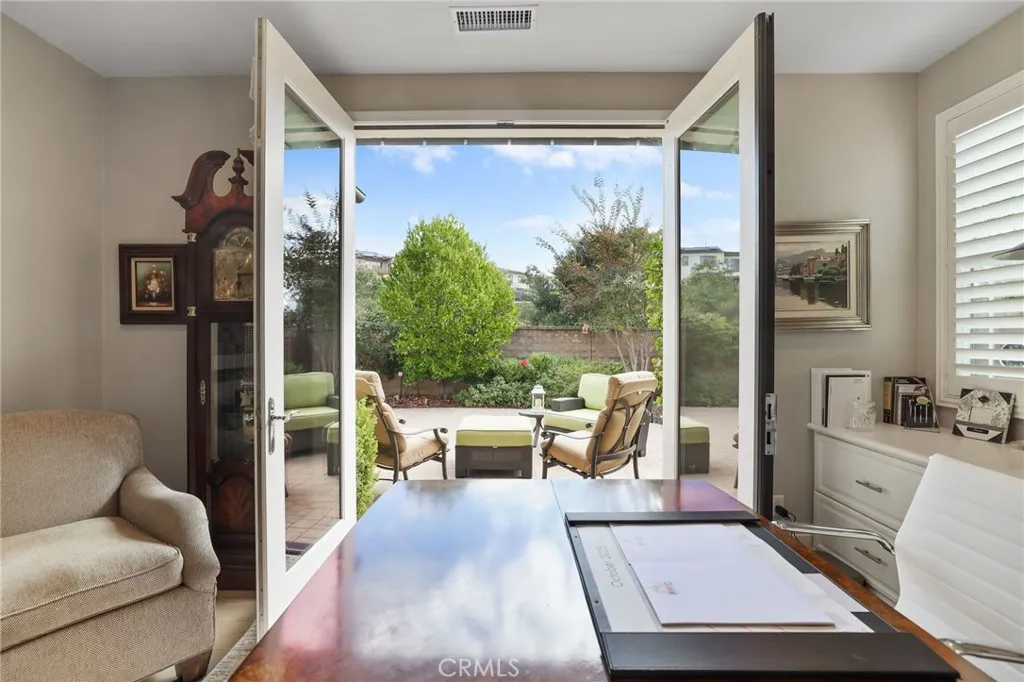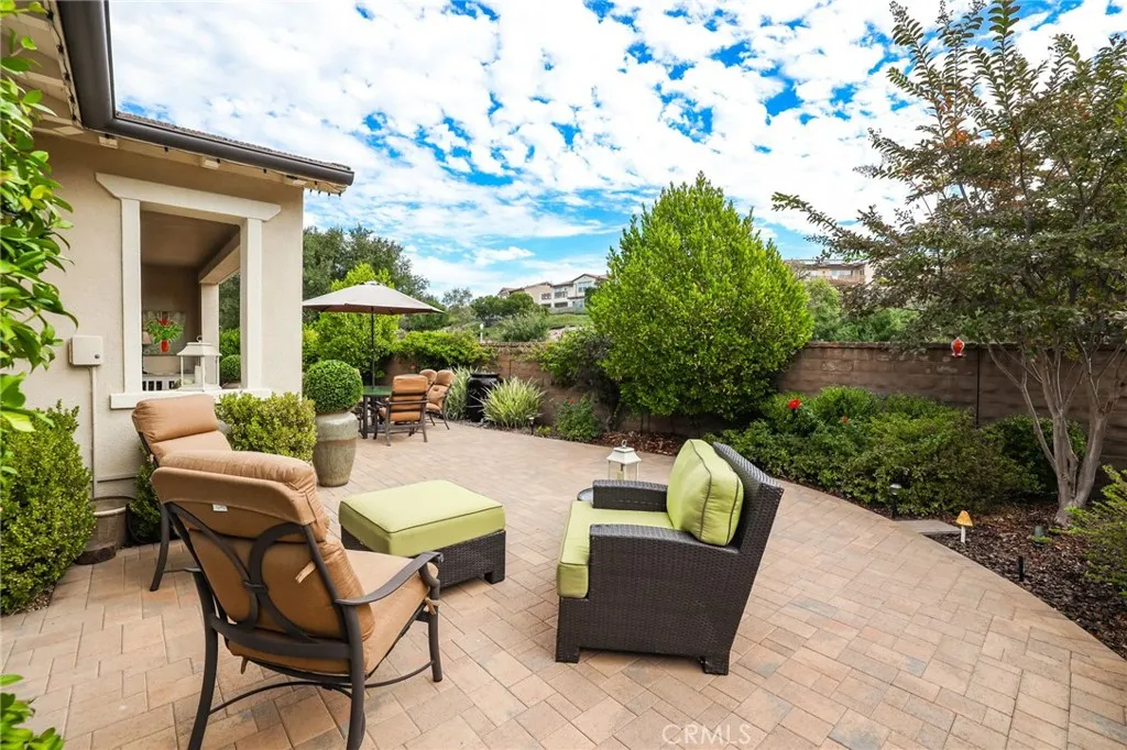 Like New | Meticulously Upgraded & Maintained | Trend-Forward Design | Private Location Step into this like-new, upgraded home with paid solar in Rancho Mission Viejos 55+ Cortesa community. Featuring 2 bedrooms, 2.5 baths, a versatile office, and 2,116 sq. ft. of single-level living, it perfectly balances comfort and functionality. The great room is filled with natural light, wide-plank hardwood flooring, custom drapes, LED lighting, and surround sound wiring, ideal for entertaining or relaxing. The chef-inspired kitchen includes white shaker cabinets, quartz countertops, stainless steel appliances, a walk-in pantry, Huge center island with bar seating and storage, recessed lighting, and a designer tile backsplash. The primary suite offers a spa-like bath, built-in storage, ceiling fan, and shutters, while guests enjoy their own suite with quartz-finished bath and closet built-ins with shoe racks. Additional features include a powder room, well-appointed laundry with extra storage, and upgraded baseboards. Step outside to a private backyard oasis with a covered fireplace wired for TV and sound, built-in BBQ, water feature, paver walkways, artificial turf, and exterior lighting. Rancho Mission Viejo 55+ residents have access to all community amenities, including The Hacienda, The Outlook, The Getaway, and BBQ Barn, featuring pools, fitness centers, and social spaces for recreation and connection. Beautifully upgraded, energy-efficient, and move-in ready, this Cortesa home perfectly balances comfort, privacy, and style!
