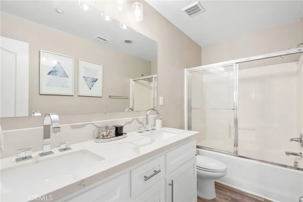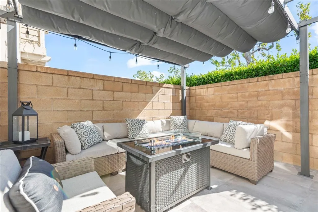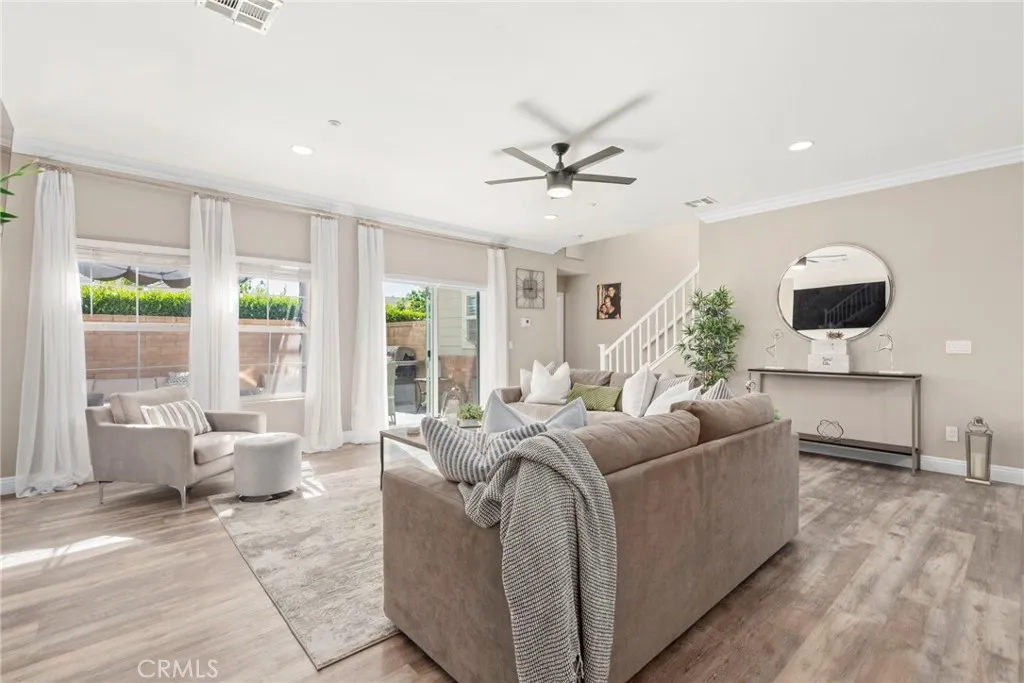 Welcome to Your Dream Condo in the Highly Sought-After Brighton at Etiwanda Community- BUILDING #3! This stunning residence boasts the second-largest floor plan in the community and showcases an open-concept layout that perfectly blends space, style, and comfort for modern living. Downstairs, youll find a beautifully upgraded kitchen with quartz countertops, a large island accented with pendant lighting, stainless steel appliances, a wall-mounted range hood, wine fridge, built-in microwave, an a backless gas range with oven, pantry, crown molding, central air and heating, and laminate flooring flow seamlessly into the spacious family room, complete with a cozy electric fireplace, ceiling fan, and sliding glass doors leading to a sunny tiled patio with a charming Pergola, perfect for relaxing or entertaining in style. Adjacent to the kitchen is a dedicated dining area, ideal for family meals and gatherings. The attached two-car garage with direct access features epoxy flooring and a large mirrored storage closet-ideal for storing seasonal dcor and more. A convenient half-bathroom and additional storage closet complete the lower level. Upstairs, enjoy a laundry area behind elegant double frosted glass doors, with built-in cabinetry for added storage. The spacious primary suite boasts a charming chandelier, walk-in closet with built-in organizers, mirrored doors on both sides, and a chandelier. The en-suite bathroom offers a dual-sink vanity, a soaking tub, and a glass-enclosed shower with dual access (one leading to the soaking tub). Two additional bedrooms each feature ceili