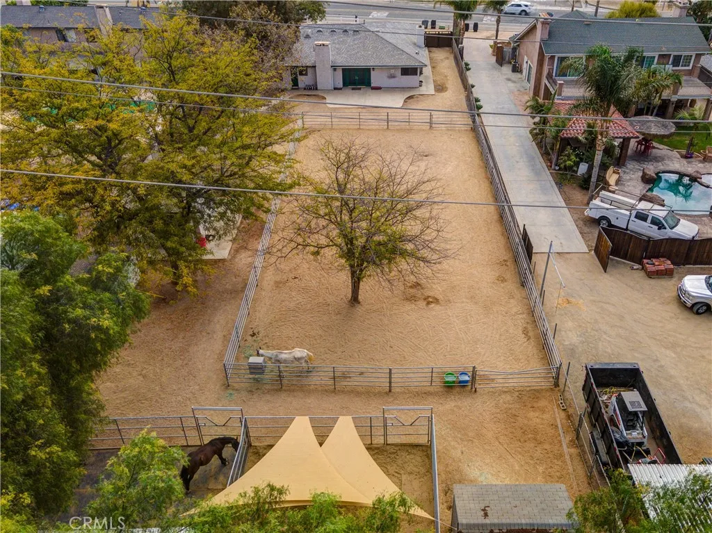 Welcome to Horse Town USA! This property is ideal for horse trainers, riders, and horse lovers alike. Situated on a 20,473 sq. ft. lot, it offers exceptional amenities for equestrian activities. This community is renowned for its horse trails, which are directly accessible from the property. The dedicated horse arena measures 48' x 97' with 1 7/8" pipe fencing, perfect for riding and training. It includes three horse stalls: (2)24' x 24' welded wire stalls and(1) 12' x 12' stall. Additionally, there are two tack rooms, which can also serve as storage. The small building in the back is versatile and could be used as a trainer's office, for extra storage, or even a playroom. The grounds are covered with decomposed granite (DG), and there's convenient access from the front to the backyard for horses or hay deliveries. The comfortable 4-bedroom, 2-bathroom house features two fireplaces, one in the living room and another in the family/dining room. New laminate flooring has been installed in the living room, family room, and kitchen, making it a truly move-in-ready home. We invite you to come and see this property for yourself and envision your family living here.