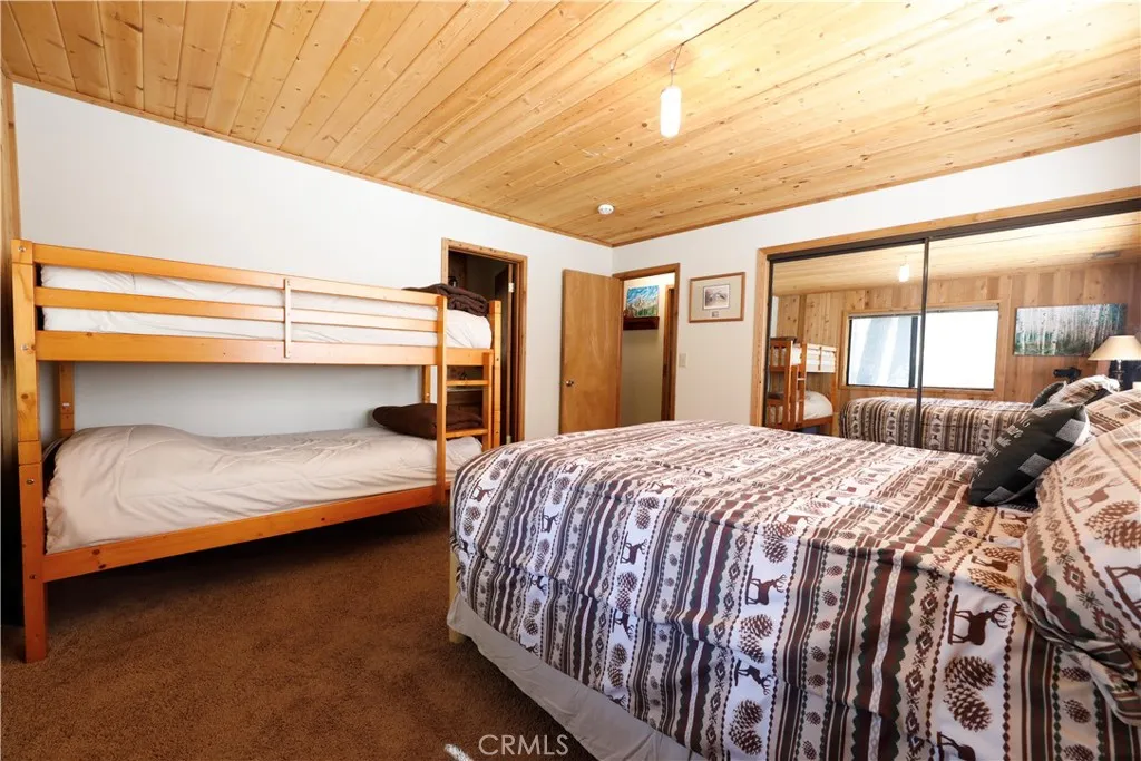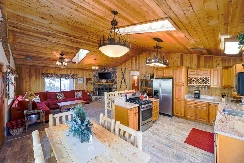 Cozy Mountain Retreat Near Bear Mountain. Nestled among towering pines and oaks, this beautifully maintained 2-bedroom, 2-bath cabin offers the perfect blend of rustic charm and modern comfort. The inviting great room features vaulted T&G ceilings, skylights, and an open floor plan ideal for relaxing or entertaining after a day on the slopes. The updated kitchen boasts granite countertops, stainless steel appliances, and warm wood cabinetry that complements the cabins natural feel. Both bedrooms are spacious and comfortable, while the two full bathrooms provide convenience for family and guests. Step outside to a spacious deck surrounded by serene treed views... perfect for morning coffee or evening stargazing. Recent upgrades include a newer roof and fresh exterior paint, giving you peace of mind for years to come. Located just minutes from Bear Mountain Resort, the golf course, Big Bear Alpine Zoo, shopping, and local coffee shops, this well-kept home is ideal as a mountain getaway, full-time residence, or investment property. Come enjoy the Big Bear lifestyle in this charming, move-in-ready cabin!