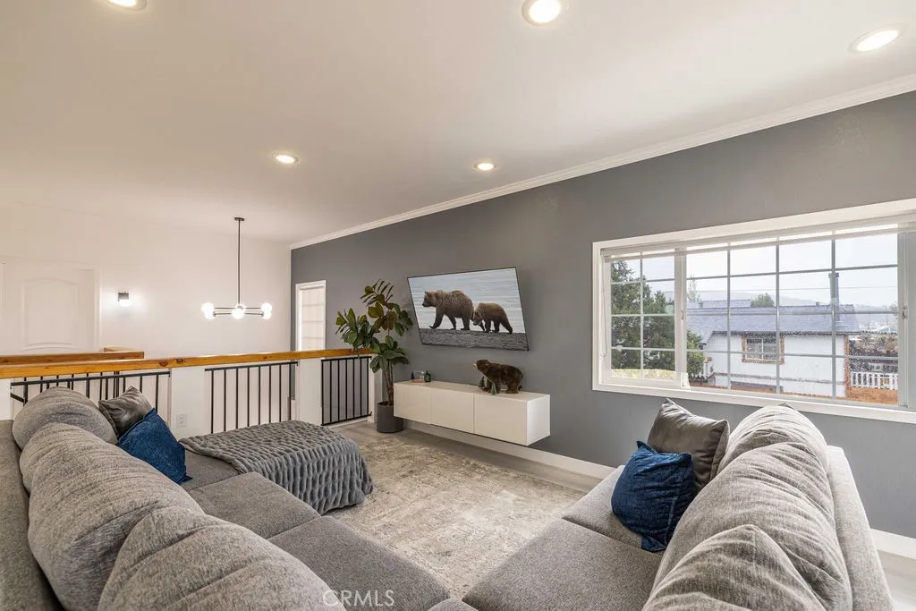 Panoramic mountain and ski slope views! Built in 2008 and recently remodeled, this beautifully updated home blends modern design, comfort, and year-round mountain beauty. It captures stunning views of Snow Summit, Bear Mountain, and the surrounding ranges from nearly every window. Step inside to a light-filled open floor plan where large dual-pane windows fill the living area with natural light. The space flows seamlessly into the dining area and upgraded kitchen, featuring tons of cabinet storage space, granite countertops, stainless steel appliances, and a spacious center island perfect for gathering. Enjoy cozy evenings by the freestanding wood-burning stove or start your mornings on the upper deck with coffee as the sun rises over the mountains. The oversized upstairs primary suite offers a private retreat an en suite bathroom with a deep soaking tub, and a walk-in closet. Sliding doors open to a private balcony overlooking the valley, the perfect spot to unwind and take in the scenery. On the lower level, two additional bedrooms provide generous space for family and guests, along with a full bath, laundry room, and garage access. An extra-deep two-car garage, currently designed as a game room with foosball and air hockey tables; offering a great space for fun or flexible use as a gym, studio, or workshop. Outside is a large fenced yard with mature fruit trees. The home also features a tankless water heater, and plenty of parking for guests or recreational vehicles. Located just minutes from Big Bear Lake, ski resorts, and miles of hiking trails, this remodeled mountain