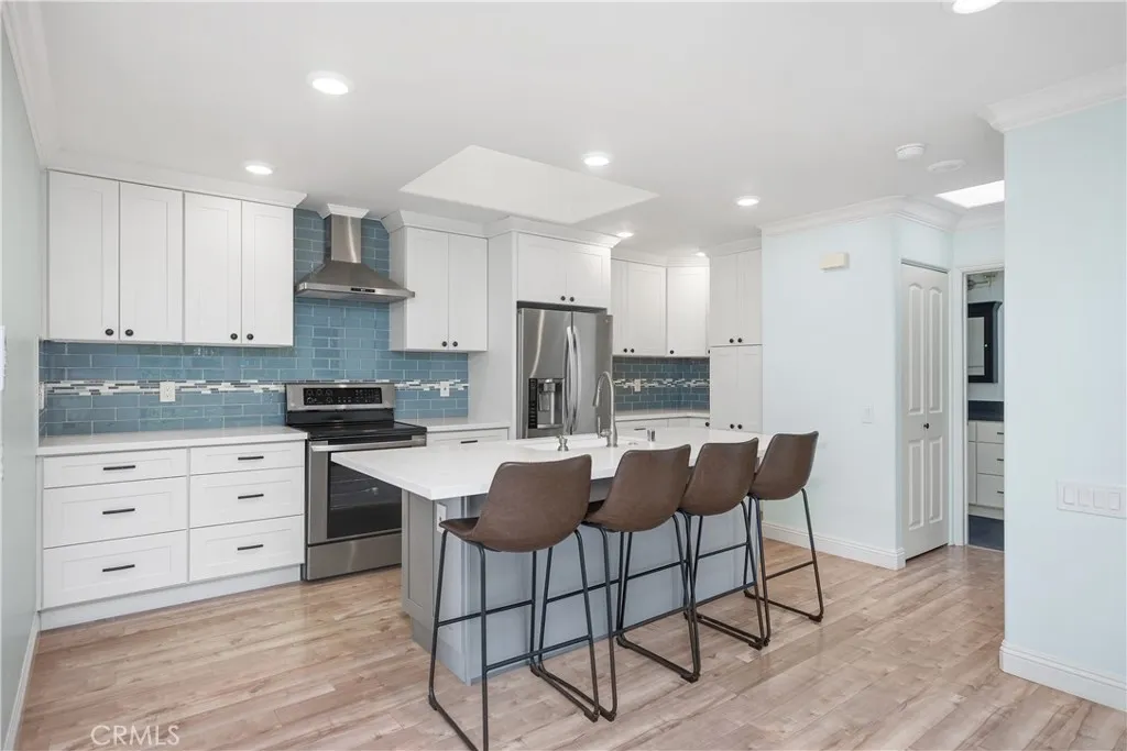 A Little Slice of Paradise! This open-concept, fully remodeled, end-unit "MONTEREY" model single-level has NO STAIRS, with no one above and one unit below, features an added primary bath. A beautiful home, newly painted and full of natural light, truly one-of-a-kind. Gourmet, island kitchen with quartz countertops; tiled glass backsplash; stainless steel appliances; generous white wood cabinets with soft-close doors & drawers; and added recessed lighting. In addition, the large-capacity Washer/Dryer, Skylights in the kitchen, living room, and hallway, and solar tubes in each bathroom make the unit light and bright. This is thanks to the floor-to-ceiling windows in the living room and bedroomsa versatile split floorplan with bedrooms on opposite sides. The primary bedroom's mirrored closet was remodeled to add more storage. Both bathrooms feature white wood cabinets, modern quartz countertops, walk-in tiled showers with glass enclosures, and added solar tubes for natural light. The primary bathroom has double sinks & mirrored medicine cabinets, laminate wood-look flooring throughout the living spaces, and porcelain tiles in the bathrooms. The comfortable living room is accented by a custom electric fireplace with tile surround, floor-to-ceiling windows, and two added skylights. Many premium upgrades throughout, including double-pane vinyl windows, custom window coverings, new energy-efficient ductless mini-split heating/air units, custom extra-wide baseboards & crown molding, an upgraded front door & paneled interior doors with custom casings, a retractable front door screen
