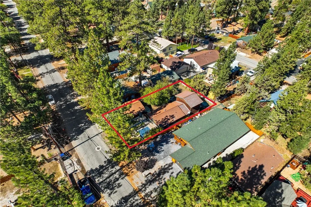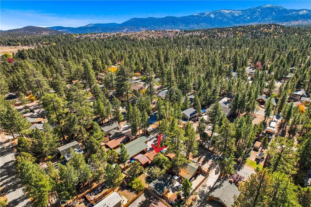 This charming and quaint mountain cabin offers 2 bedrooms, 1 bath, and approximately 1,064 sq ft of living space on a flat and spacious 5,000 sq ft lot with a detached 2-car garage. Surrounded by mature pine trees and natural beauty, the setting is serene and picturesque, perfect for those seeking a peaceful getaway, a second home, or a smart investment opportunity such as an Airbnb or short-term rental. As you enter the gated front yard, youre greeted by custom walkways, lush greenery, and an expansive front porch with built-in benchesan inviting space to relax and take in the crisp mountain air. Inside, the cabins warm and rustic character shines through with wood-beamed ceilings, tongue-and-groove paneling, and two cozy wood-burning stovesone in the dining area and another framed by a striking brick fireplace in the family room, creating inviting spaces to gather and unwind. The kitchen features raised-panel maple cabinets, easy-care countertops, and a custom tile backsplash that adds charm and color, seamlessly opening to the dining area for comfortable gatherings. Downstairs, youll find a cozy bedroom and a full bath with a light wood vanity, integrated sink, and designer tile tub-shower surround, blending rustic appeal with modern function. Upstairs, the vaulted wood-beam ceilings continue in the peaceful second bedroom, where large windows frame tranquil treetop views and a bold accent wall adds a touch of contemporary flair. Out back, the fully fenced yard offers the perfect outdoor retreat, complete with mature trees that provide shade and privacy, a sitting area i