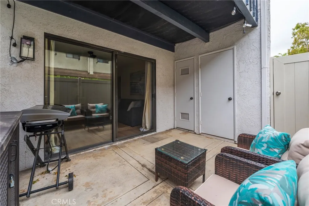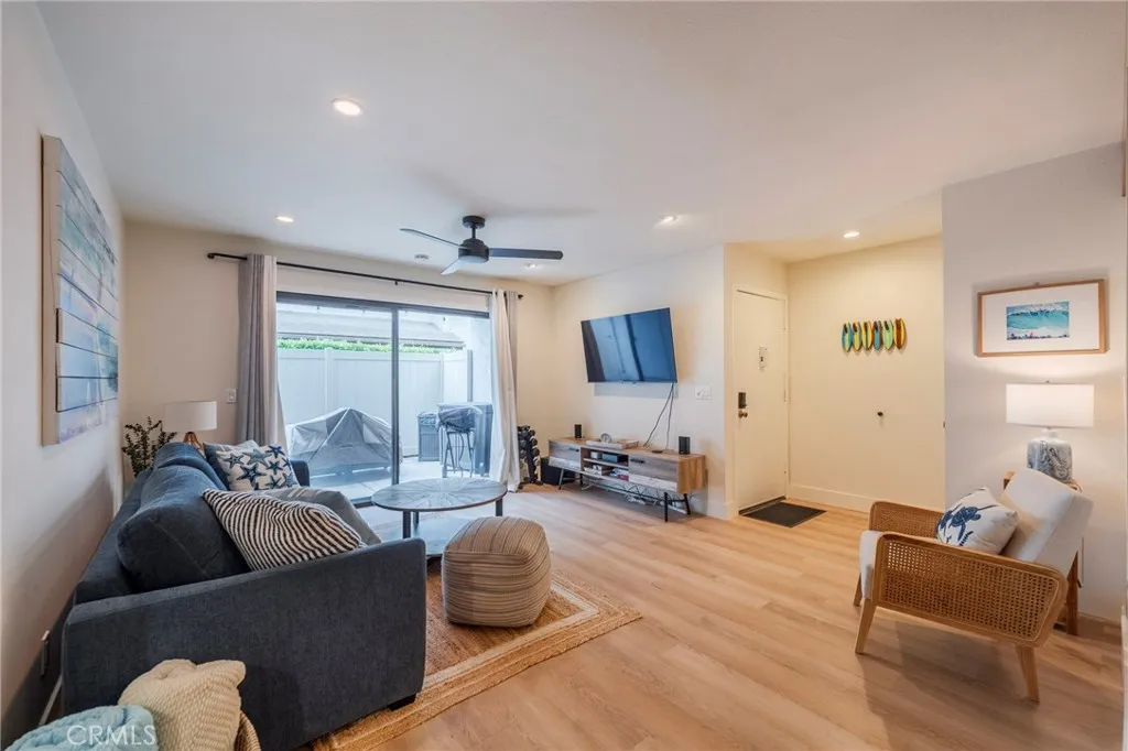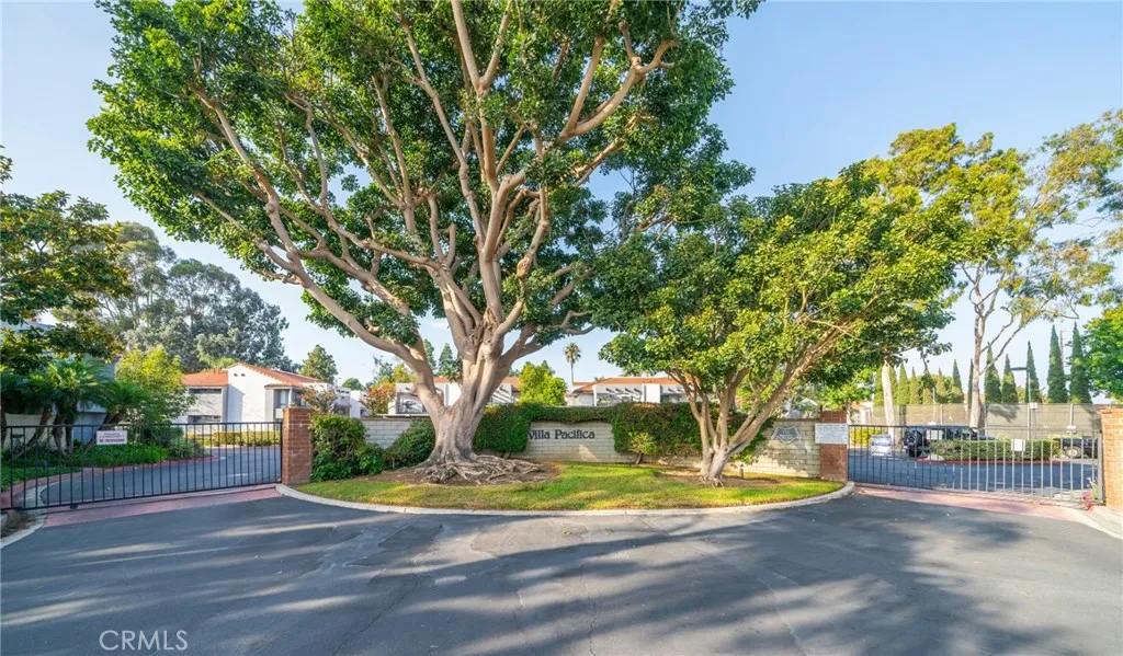 Gorgeous Villa Pacific condo just a bike ride to the Beach ..Formerly owned and professionally decorated by HGTV Designer so it shows just like a model and is move in ready.The turnkey property could include all furnishings and is easy first floor access with no stairs in this small -81 unit gated community.Stainless appliances , built in refrigerator and dishwasher with the cabinet panels on them, barn style sink and pull out custom faucet handle..Wood style flooring throughout make this unit light and bright.sliding door to outside patio , extra storage.Dining area with built ins, inset lighting..living room with flat screen TV .Master has a walk -in closet, tiled custom shower ,quartz counters in sink area .This unit has inside washer /dryer - rare ...The complex has a tennis court ,pool /spa /sauna and washer /dryer room .Perfect for vacation get away or first time buyer place. There is also a covered numbered parking spot for this unit and guest parking .
