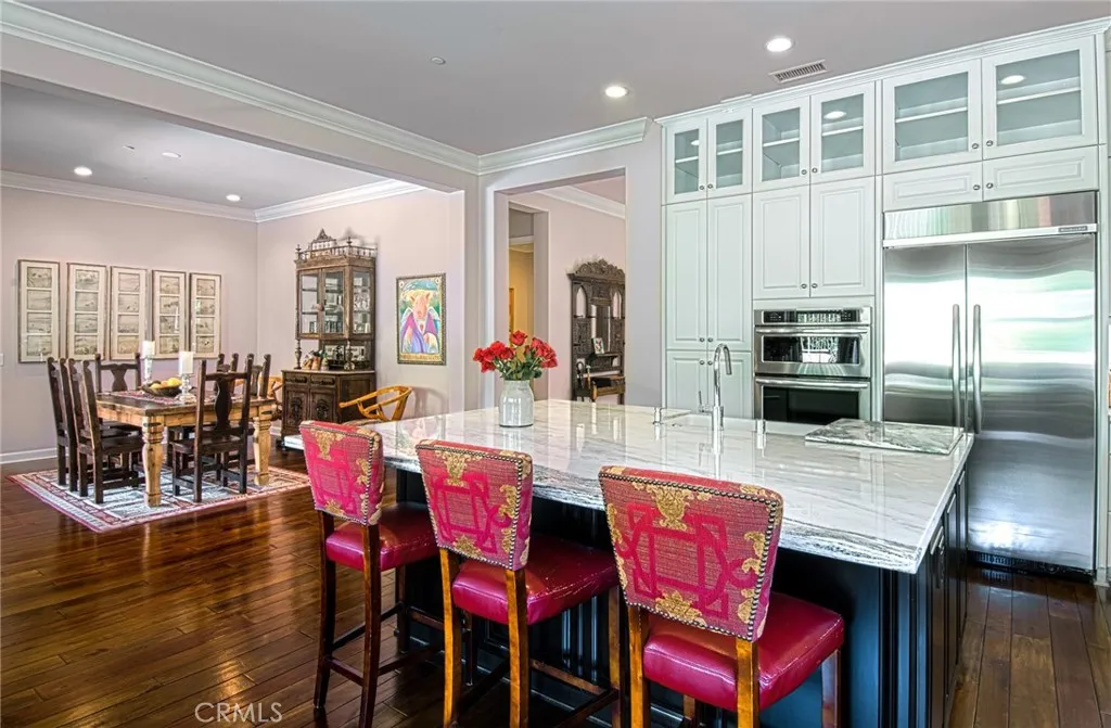 Exceptional Single-Level Home in the Prestigious 55+ Gated Community of Sendero Gavilan. Welcome to this stunning 2 bed, office, 2 1/2 bath home situated on a premium end lot next to a peaceful pocket park. From the moment you arrive, the custom paver driveway and wrought-iron gated entry set the tone for the elegance and charm found throughout this home. Step through the inviting wood front door into a beautifully designed, open-concept living space featuring 10-foot ceilings, rich hardwood floors, crown molding, solid core doors, and designer baseboards. Every inch of this home reflects quality craftsmanship and thoughtful upgrades. The gourmet kitchen showcases a grand marble island, ceiling-height white cabinetry with glass insets, farmhouse sink, marble backsplash, and top-of-the-line stainless steel appliances, including a built-in KitchenAid refrigerator, 6-burner chefs range, and a pot filler. Roll-out drawers make organization effortless. The great room flows seamlessly to the 228 sq. ft. Outdoor Retreat, complete with a fireplace, ceiling fan, recessed lighting, and flat-screen TVideal for year-round entertaining. Step outside to your private backyard oasis featuring custom pavers, artificial turf, a large in-ground spa with fountain, citrus trees, and container gardens, all overlooking a tranquil greenbelt. The luxurious primary suite offers a spa-like ensuite with a dual-sink marble vanity, frameless step-in shower, porcelain flooring, marble soaking tub, and a custom walk-in closet with built-ins. The guest bedroom features an en-suite full bath, while the powd