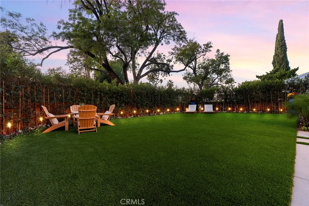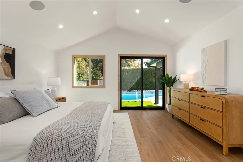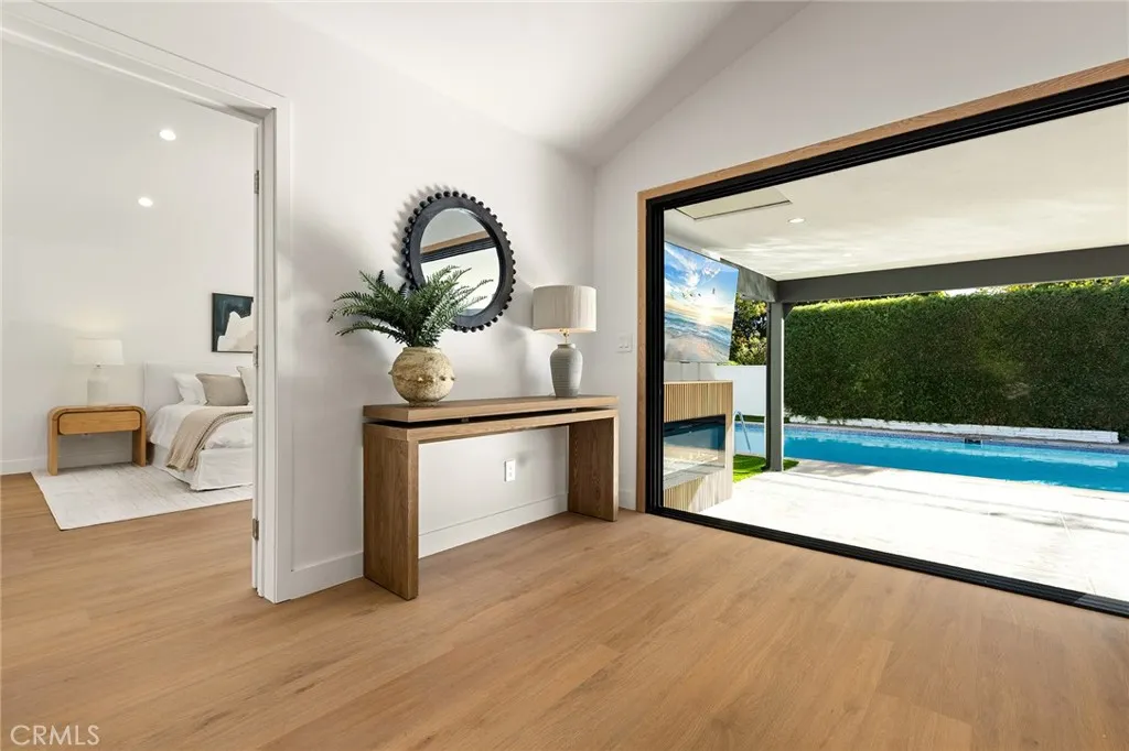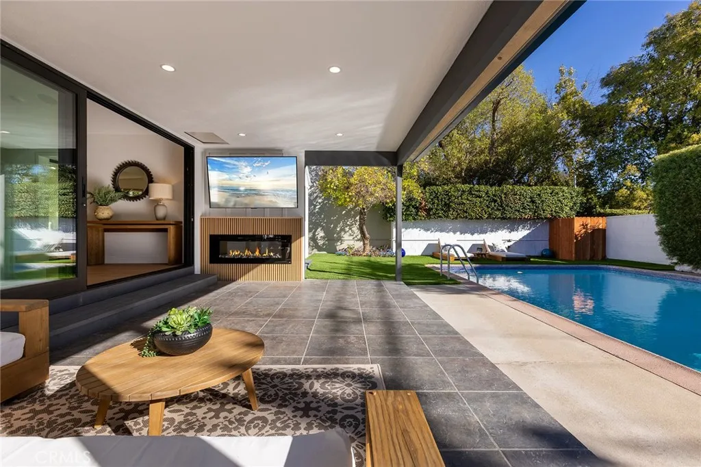 Welcome to your private retreat in Sherman Oaks, a stunning 3-bedroom, 2.5-bath luxury home on a serene corner lot with 2,041 square feet of beautifully designed living space. Behind the gates, youll find an open floor plan filled with natural light, cathedral ceilings in the living room and primary suite, and elegant honey oak wood floors throughout. The kitchen features custom cabinetry and high-end finishes that add warmth and sophistication. A large three-panel sliding glass door opens to a private backyard oasis with a sparkling pool, artificial turf, and a covered patio with a fireplace and TVperfect for relaxing or entertaining friends and family. The property also includes a spacious front yard with artificial turf, providing plenty of room for outdoor gatherings, kids play, or hosting lively summer parties. This home is equipped with six surround sound speakers controlled by an iPad, recessed lighting throughout, and a finished garage with epoxy floors and built-in lighting, ideal for a gym, office, or game room. Surrounded by mature ficus trees that create total privacy, this home combines comfort, style, and smart design for effortless living. Adding even more appeal, this home is located near Kester Avenue Elementary School, a highly regarded neighborhood school known for its excellent academic programs, dedicated teachers, and strong sense of community.