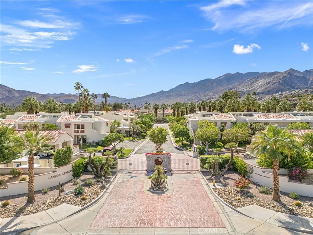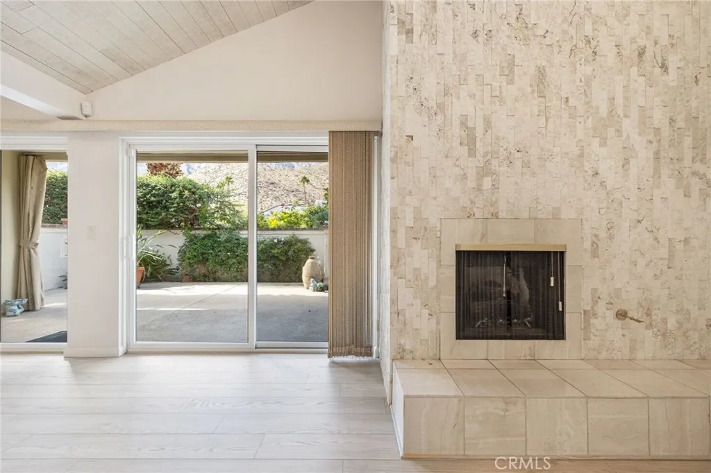 Discover this exceptional mid-century modern condo that offers the privacy and spacious feel of a single-family home. Situated in a gated community, this charming West-facing, end-unit, single-story home features brand new luxury vinyl floors, fresh paint throughout, and numerous upgrades including shutters, fridge, microwave, washer, dryer, and a brand-new water heater. In addition, there is no land lease providing long term value! The spacious living and dining areas feature stunning vaulted tongue-and-groove wood ceilings and a beautiful split marble fireplace, creating a light and airy ambiance complemented by breathtaking views of the San Jacinto Mountains. Step outside to the custom built front lanai; perfect for morning coffee surrounded by mature landscaped grounds. This home also offers custom shelving in the closets and garage, providing smart storage solutions. The back patio shares a yard with the neighboring unit and offers a private entrance to one of the pools. Resort-style amenities include two, tennis courts (one striped for pickleball!), pools and spas. Only one of several units to offer a convenient, attached one-car garage with direct access. Walk to downtown Palm Springs and enjoy the varied museums, unique shops, and incredible restaurants. Experience the perfect blend of classic mid-century design and elevated modern comfort in this beautifully maintained home. Dont miss out on this chance to make it yours!