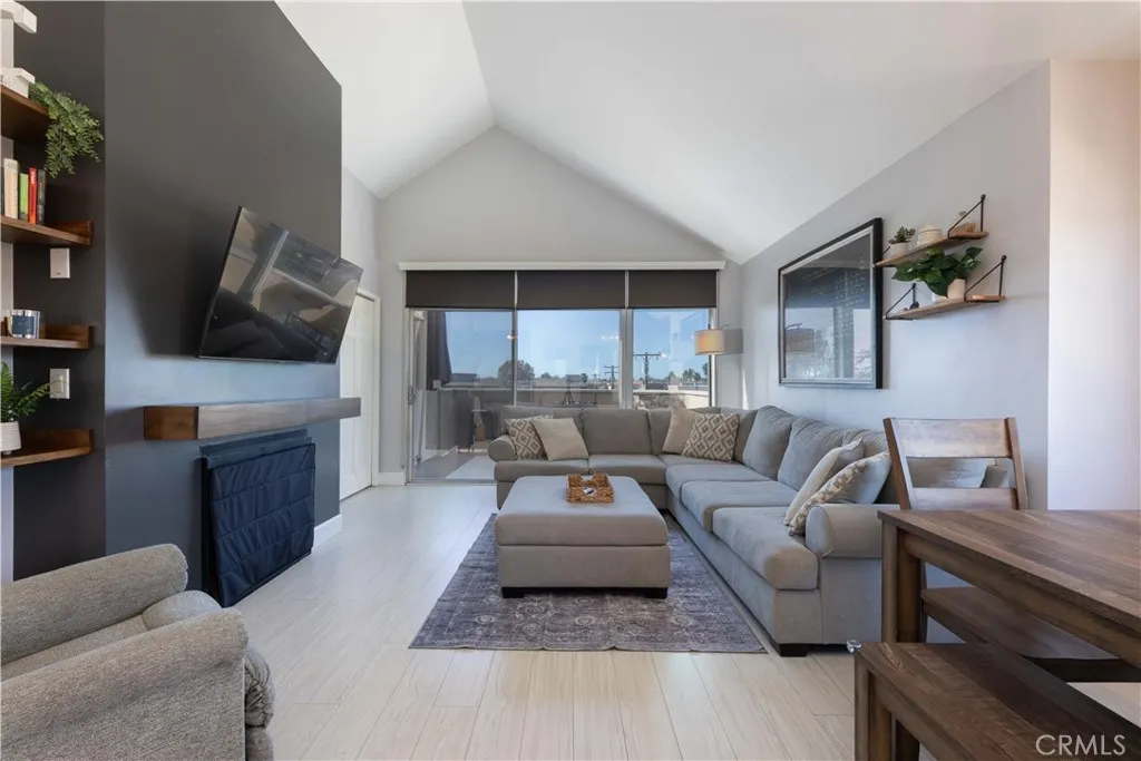 Price Improvement! Welcome to this beautifully maintained 2-bedroom, 1.25-bath corner unit in highly desirable Los Alamitos, offering 915 sq. ft. of comfortable living space in one of the areas top-rated school districts. Perfectly positioned on the top floor, this light-filled condo captures the essence of SoCal coastal living with an inviting layout, thoughtful updates, and a coveted corner location that ensures both privacy and serenity. Step inside to find vaulted ceilings and laminate wood flooring that enhance the spacious open-concept living and dining areas with wall-to-wall sliding glass door and windows that have been tinted to keep things cooler on warmer days with custom shades to let in light whenever you want. The cozy fireplace creates a warm focal point for relaxing evenings, while sliding glass doors open to a large private patioperfect for morning coffee or taking in the colorful Southern California sunsets. The updated kitchen features modern stone-look countertops, ample cabinet space, a garden window, counter depth stainless steel fridge and dishwasher, gas range, and easy access to the dining area. A nearby laundry closet with in-unit washer and dryer hookups adds extra functionality and ease and washer/dryer appliances are included. Both bedrooms are generously sized, with large closets and plenty of natural light. The primary suite includes a walk in closet w/ensuite vanity that connects to a full bath and toilet tastefully finished with neutral tones and updated fixtures; there is an additional separated vanity on the opposite side of that shower an
