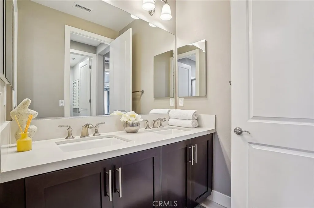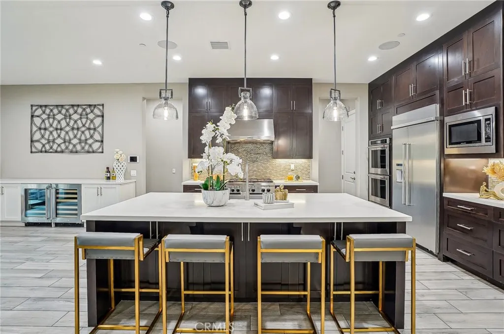 Discover this beautifully crafted home in the prestigious gated community of Avila at Porter Ranch, where luxury, energy independence, and peace of mind come together. The grand entryway features custom stone walls and a warm wood ceiling, setting the tone for a residence that blends elegance and comfort. Inside, the open floor plan offers 4 spacious bedrooms, 4 bathrooms, and a versatile loft, all framed by soaring 10-foot ceilings on the main level and designer railings along a sweeping staircase. At the heart of the home, the gourmet kitchen impresses with quartz countertops, a built-in refrigerator, soft-close cabinetry, a walk-in pantry, and an oversized island ideal for gatherings. The great rooms 15-foot stacking sliding doors open to a covered outdoor lounge, creating seamless indoor-outdoor living enhanced by a cozy fireplace and automatic window shades. Upstairs, the primary suite serves as a tranquil retreat with a private balcony and mountain views, a custom walk-in closet, and a spa-like bath featuring dual vanities, a soaking tub, and an oversized shower with surround sound. Designed for energy efficiency and resilience, the home includes a fully paid Tesla solar system with 20+ panels and three Tesla Powerwall batteries, often yielding zero electrical costs under normal use. Security and comfort are elevated with Riot Glass reinforced sliding doors on both levels, security film on all windows, and a Campbell Security steel-reinforced side garage door. Motorized patio and balcony screens allow fresh airflow while maintaining privacy. A whole- house water softe