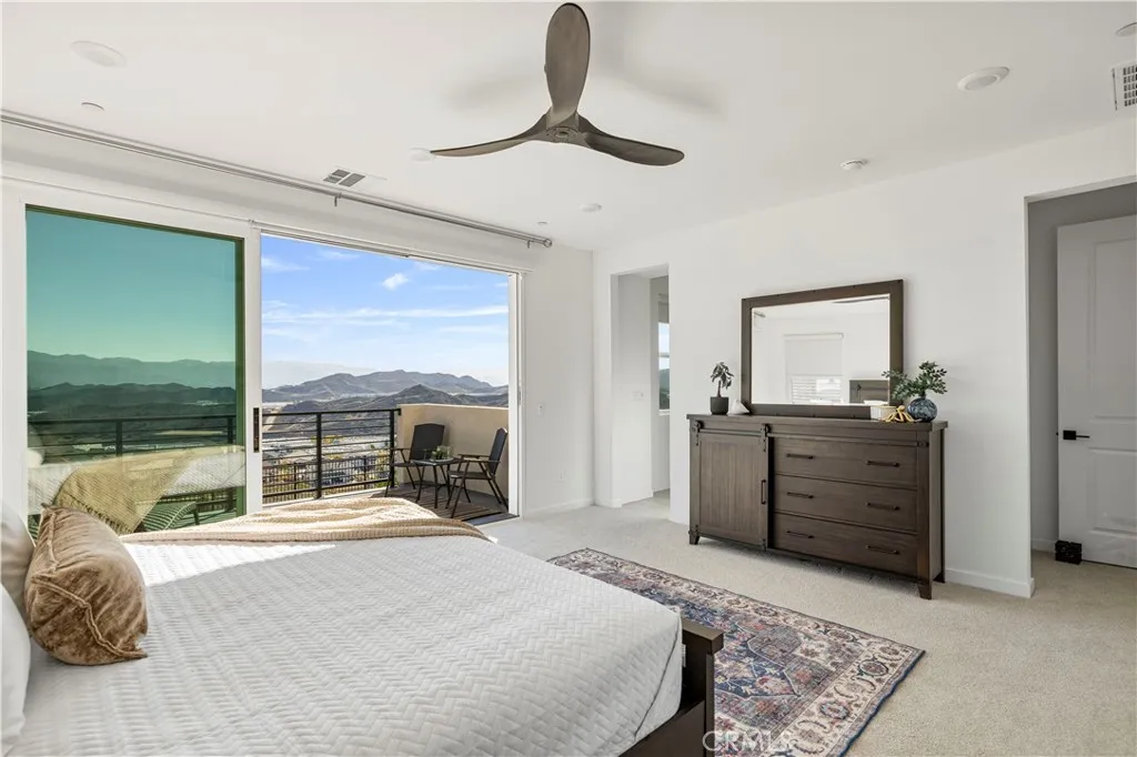 Beautifully upgraded home in the desirable Meadow Collection at Williams Ranch showcases nearly 180-degree panoramic VIEWS and incredible designer upgrades throughout. You are welcomed by a charming covered porch that invites you to sit back and stay awhile, blending comfort and curb appeal in one perfect first impression. The spacious floor plan features 3 bedrooms, a versatile loft, 2.5 baths, and a 3-car garage. An open-concept kitchen offers elegant cabinetry, stainless steel appliances, large center island, and seamless flow into the family room, where triple sliding doors open to a covered patio, ideal for indoor-outdoor living and entertaining. Upstairs, the primary suite is a true retreat featuring a spa-inspired bathroom with dual sinks, oversized shower, walk-in closet, and the triple sliding doors that lead to a private balcony with stunning city and mountain views. The two additional bedrooms with good-sized closets also have views and share access to a hallway bath with dual sinks and shower. Designed for entertaining and easy living, this custom-landscaped property features a front yard with pristine artificial turf, river rock accents, and drought-tolerant plantings. The backyard offers the ultimate retreat with ambient lighting, stylish pavers, and a resistance swim pool and jacuzzi, perfect for unwinding or hosting gatherings under the stars. Additional highlights include luxury vinyl plank flooring, custom lighting, automatic window shades, ceiling fans, tankless water heater, and PAID solar. Nestled within the master-planned gated community, residents enj
