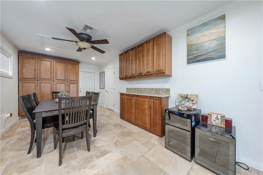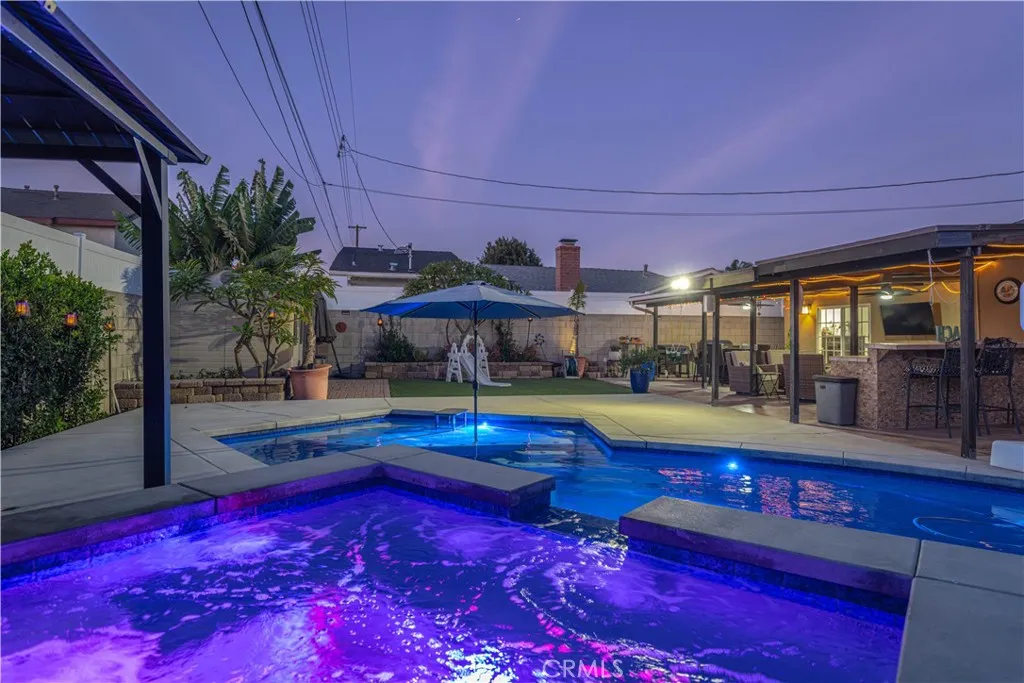 **Cul-de-Sac Location!** Welcome to this single-story home, boasting 3 well-appointed bedrooms and 3 stylish bathrooms. The heart of the home is a spacious kitchen, featuring exquisite custom accents and a convenient serve-over bar that seamlessly connects to the inviting family room, perfect for gatherings and shared moments. Retreat to the expansive primary suite that features a spa-like ensuite bathroom outfitted with custom finishes and a generous walk-in shower. Complementing this oasis is a thoughtfully designed walk-in closet, optimizing storage and space. The two additional bedrooms, paired with two well-appointed bathrooms, offer versatility for family living or guests. Step outside into your backyard paradise, highlighted by a sparkling pool, adorned with enchanting night lights, and a cascading water feature that flows from the built-in spa. The outdoor bar area is ideal for entertaining friends and family, and the spacious patio cover provides ample shade and comfort. Additional property improvements include: A complete interior repaint within the last 2 years, Paid-off solar panels, Bright shop lights installed in the garage, A 220V plug for electric vehicle charging, A widened driveway, A stylish vinyl fence topper around the exterior of the home, A new putting green in the front yard, Lush new turf along the sidewalk area, A motion sensor kitchen faucet for added efficiency, Recessed lighting throughout the house, A Nest floodlight and camera in the backyard, Motion sensor lights installed in both the front and backyard, GFCI outlets strategically added throu